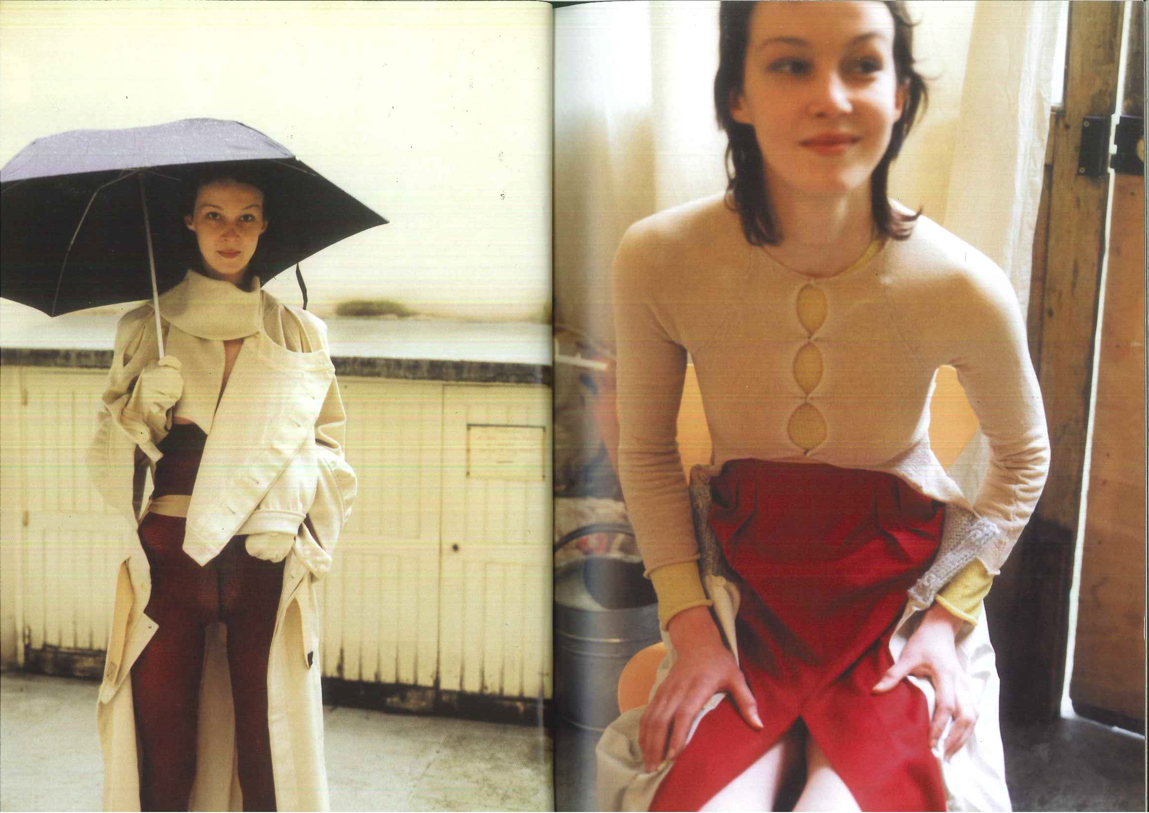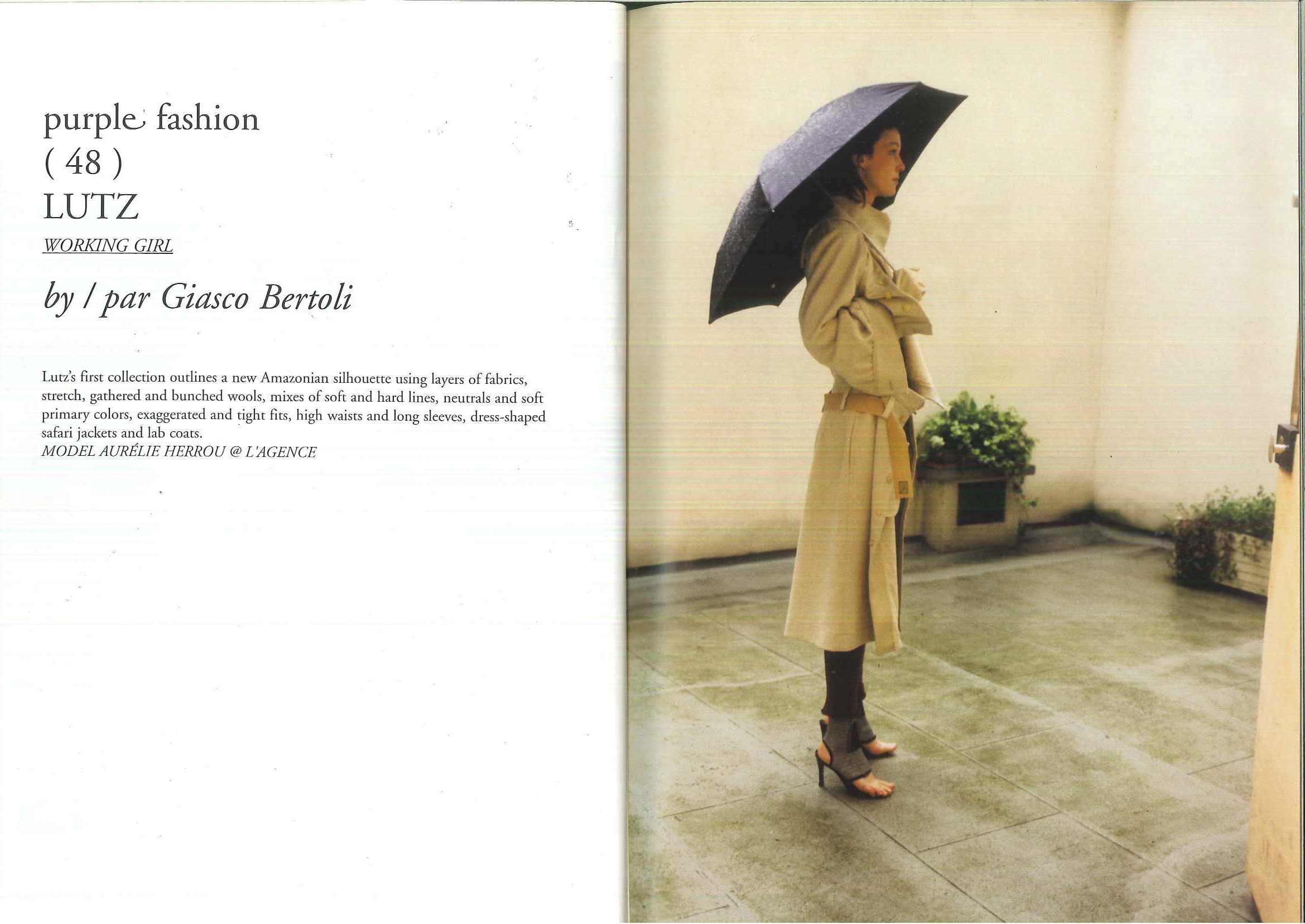 Purple Fashion (48) LUTZ No.1 by Giasco Bertoli ‘Lutz’s first collection outlines a new Amazonian silhouette using layers of fabrics,stretch, gathered and bunched wools, mixesof softand hard lines,neutrals and soft primary colours, exaggerated and tight fits, high waists and long sleeves, dress-shaped safari jackets and lab coats.’