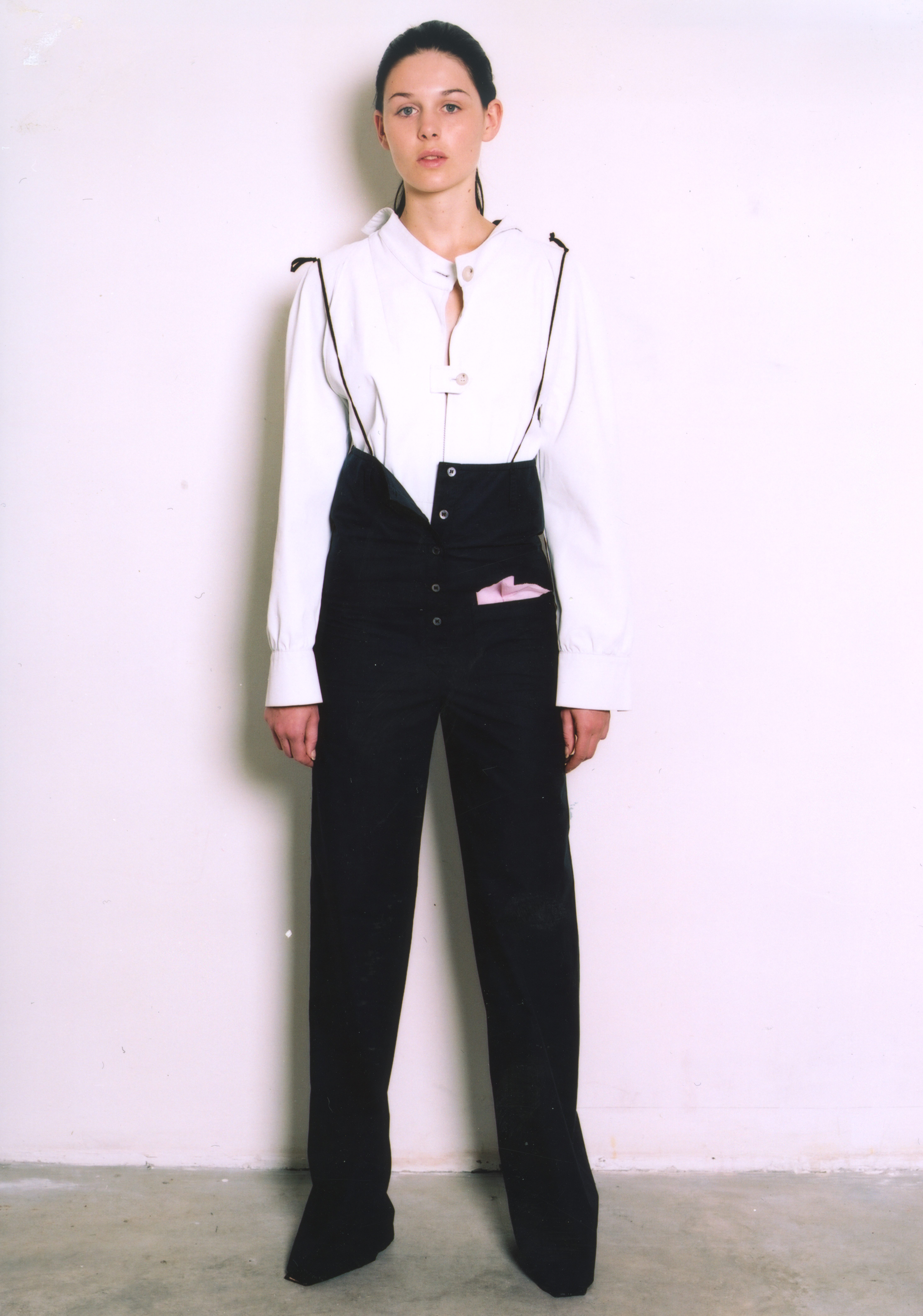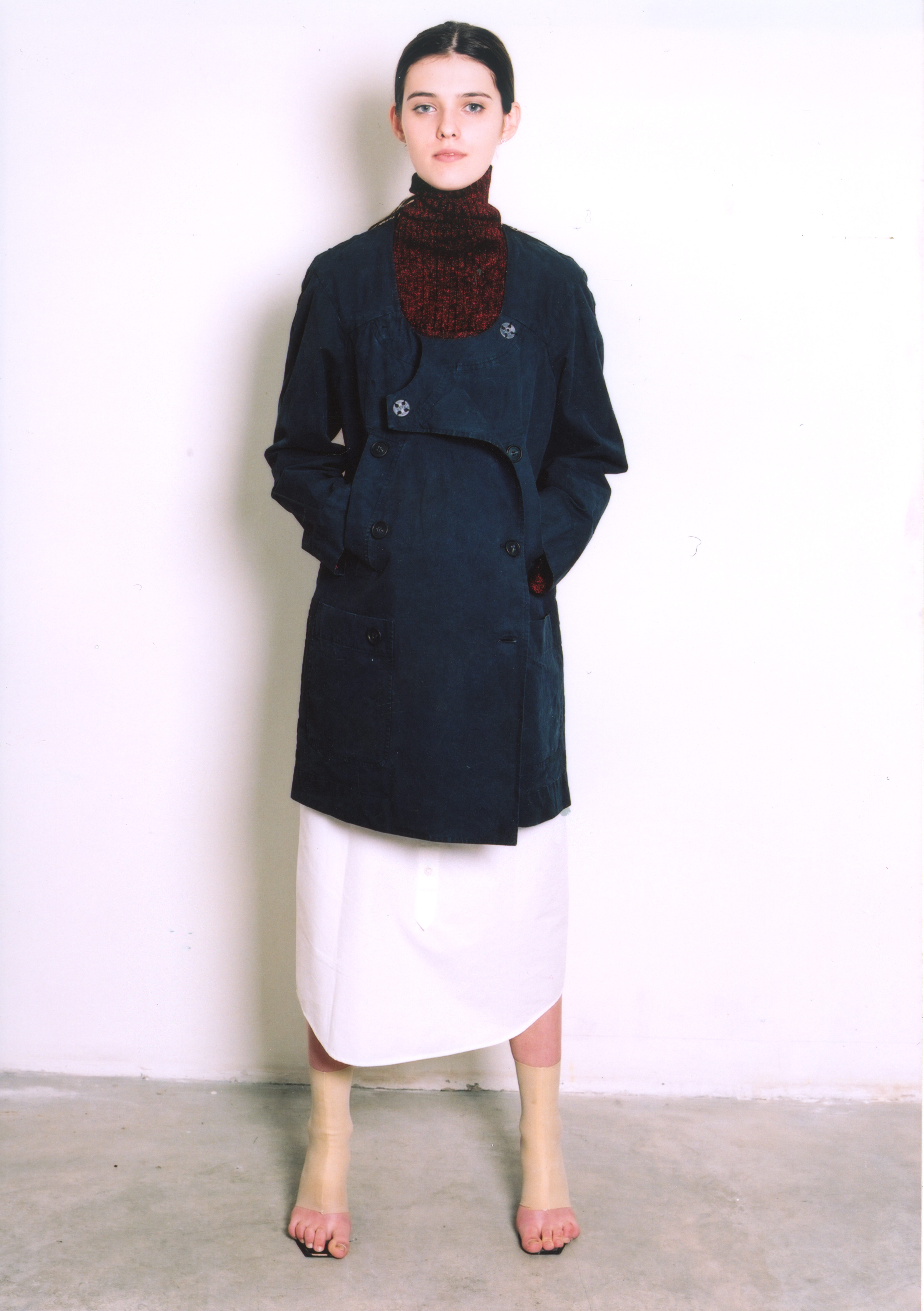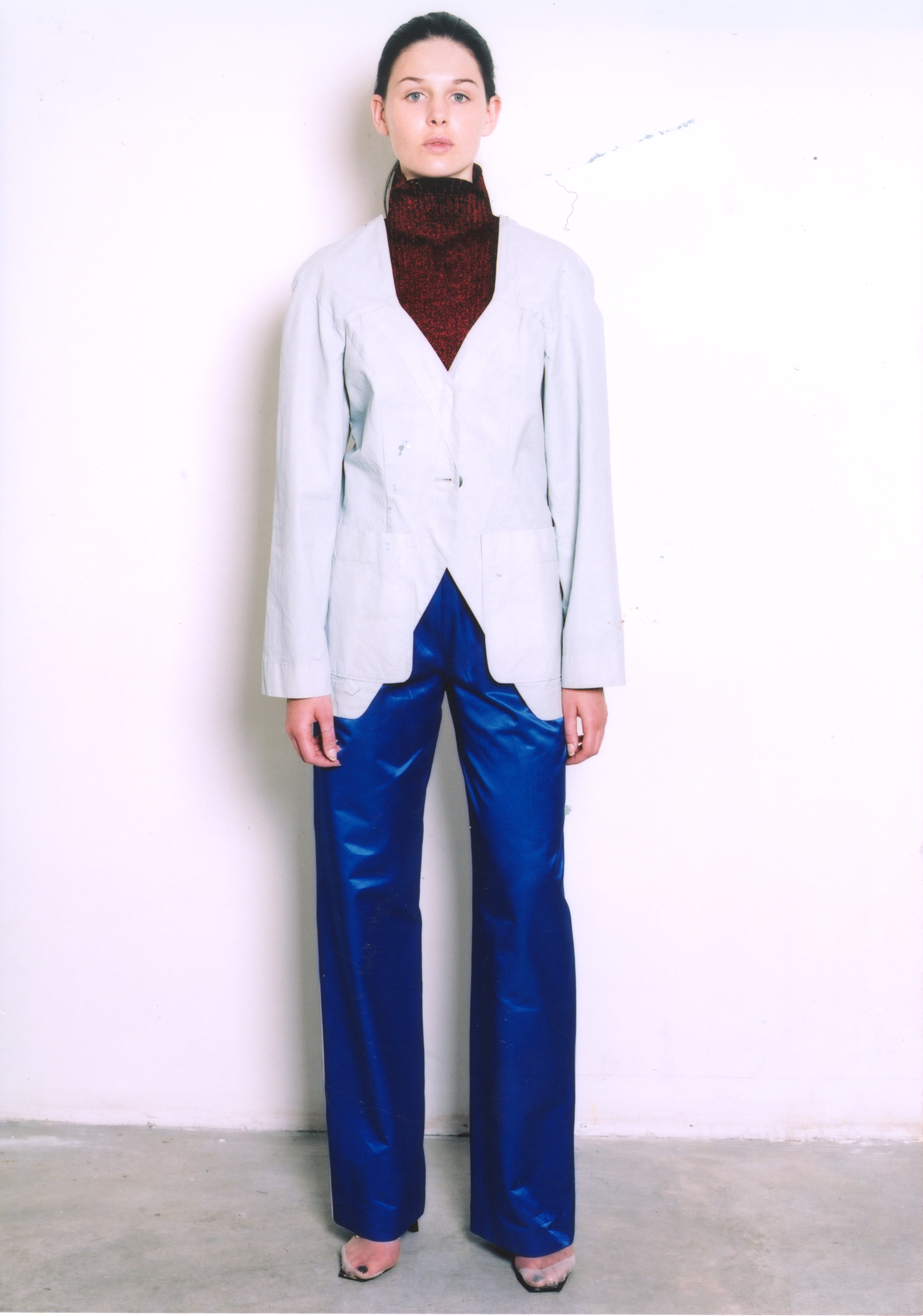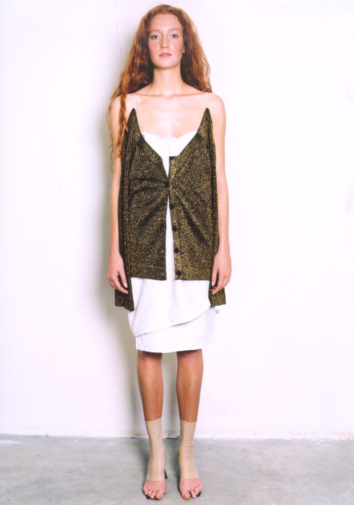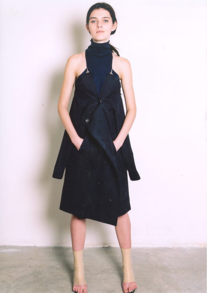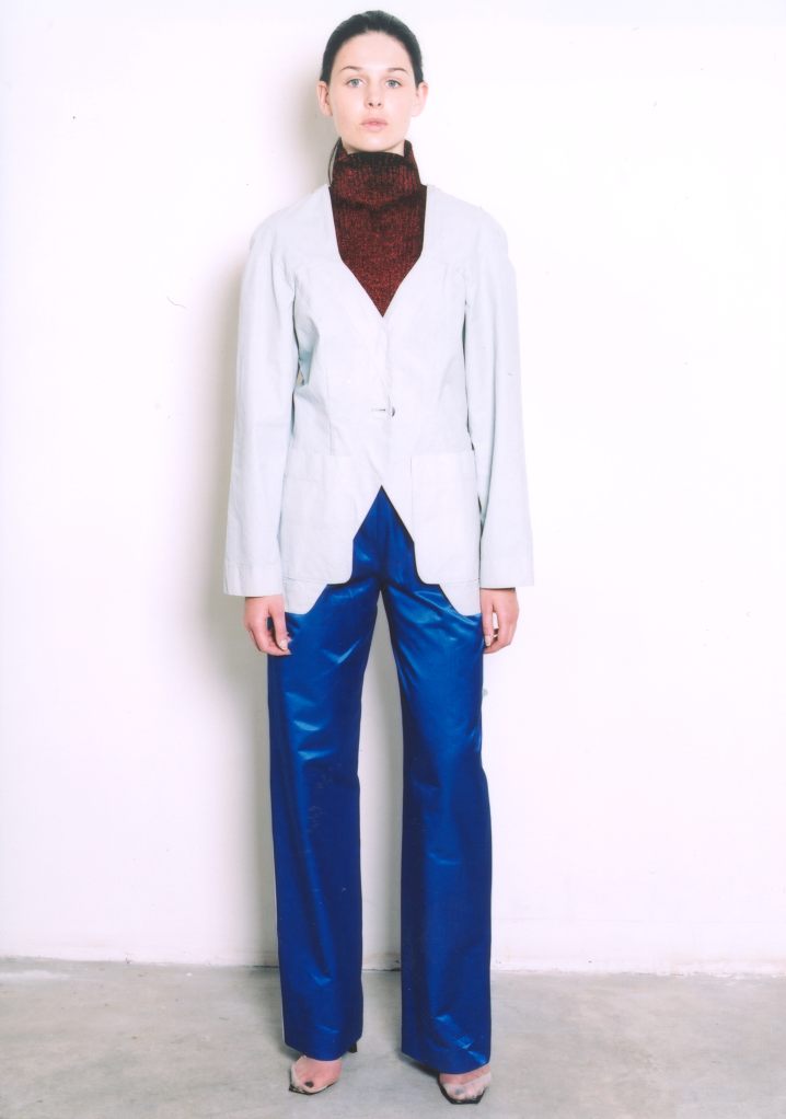 LUTZ HUELLE No.2 S/S 2001 ‘The Boxeuse’ Inspired by Boxing, and the slouchy attitude of clothes that are too long, too short, very low on the hips ,or very high up the waist. Jackets and Trenchcoats were gliding down the body, opening up shoulders and Decolletes; Pants and Skirts were riding up the body, elongating the shilhouette. Towels were worn with gold Cardigans as evening dresses, and the only Tailleur was in Sweatshirt, with Lurex Finishings.