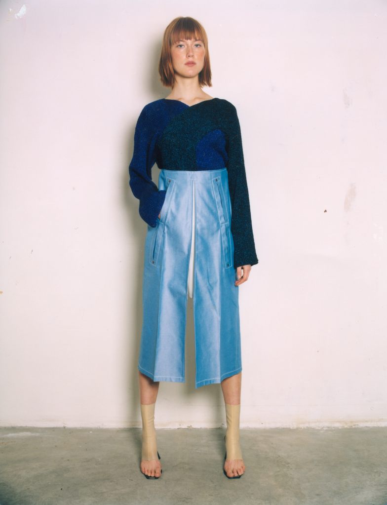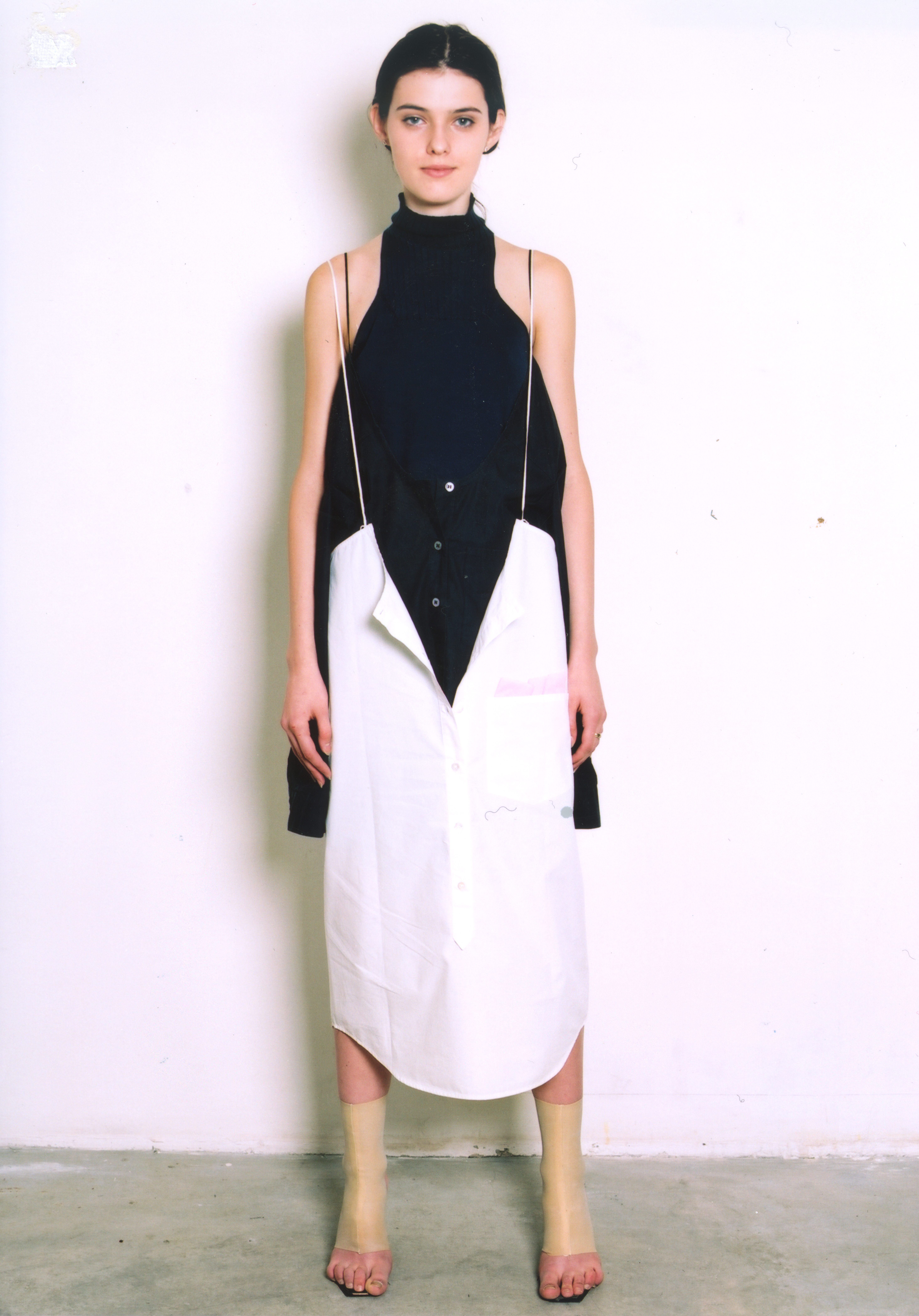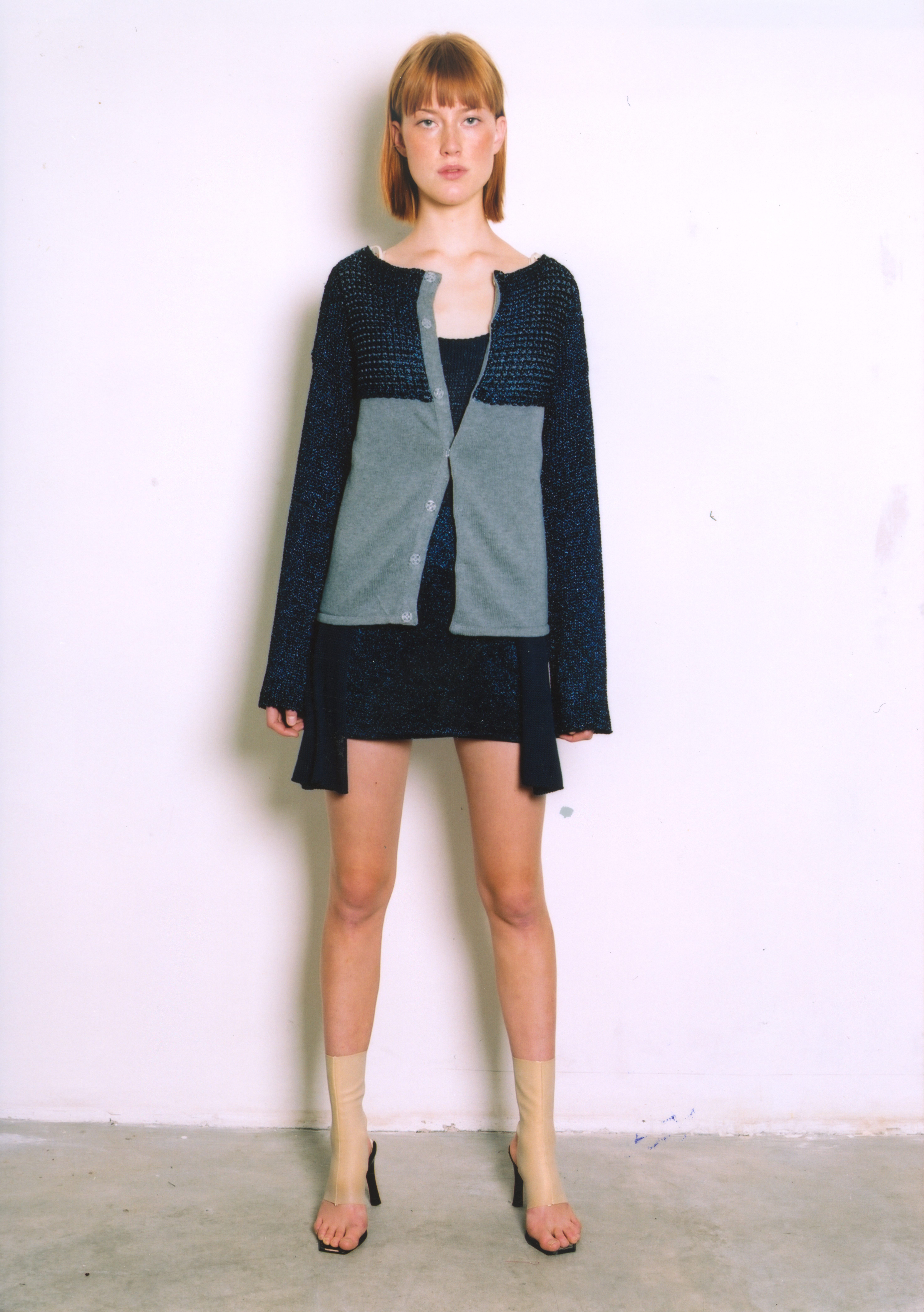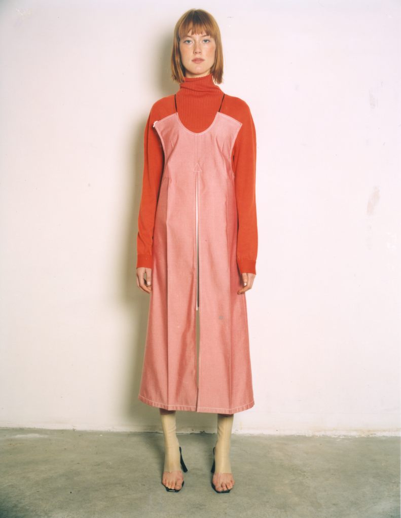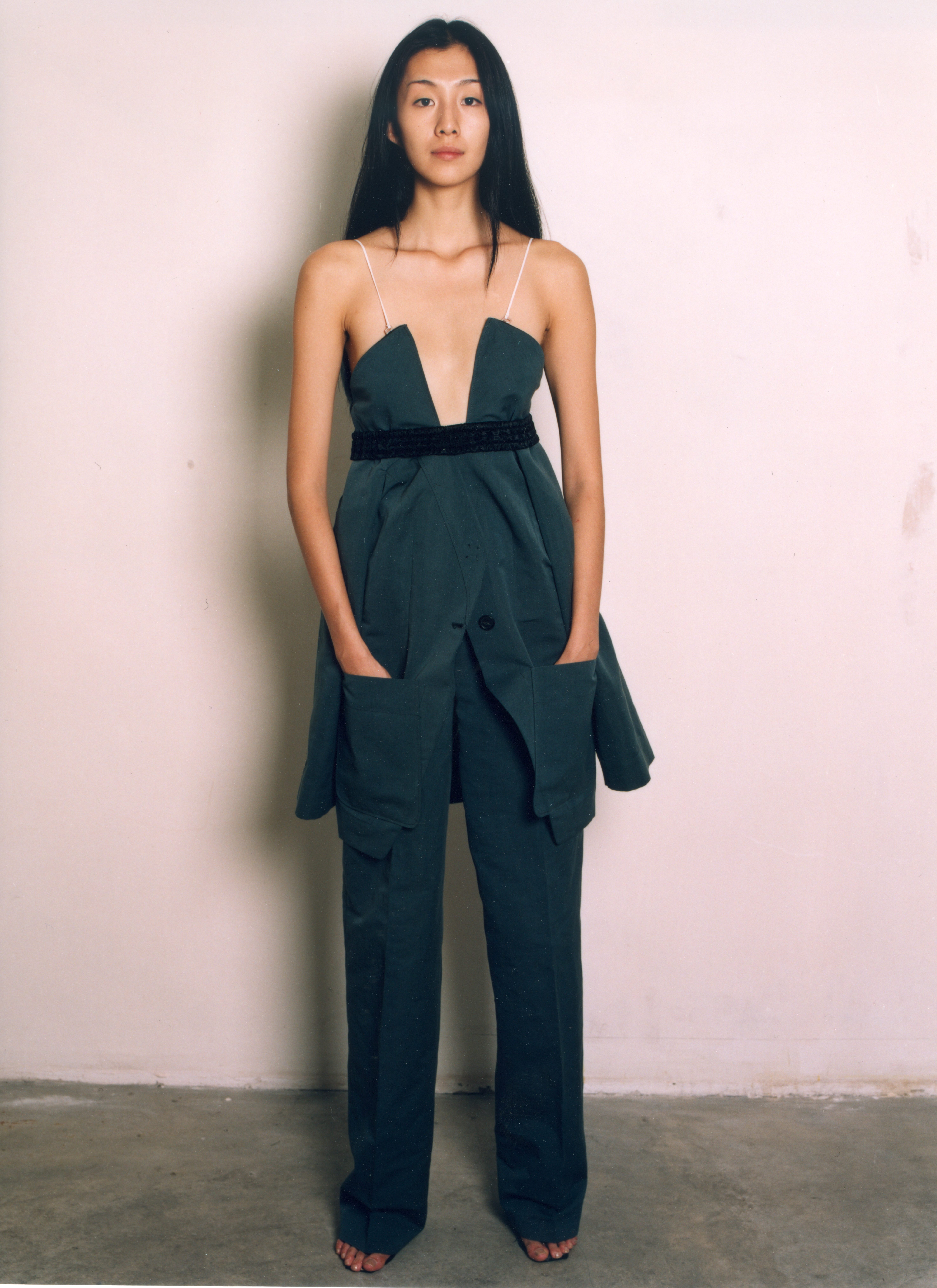 LUTZ HUELLE No.2 S/S 2001 ‘The Boxeuse’ Inspired by Boxing, and the slouchy attitude of clothes that are too long, too short, very low on the hips ,or very high up the waist. Jackets and Trenchcoats were gliding down the body, opening up shoulders and Decolletes; Pants and Skirts were riding up the body, elongating the shilhouette. Towels were worn with gold Cardigans as evening dresses, and the only Tailleur was in Sweatshirt, with Lurex Finishings.