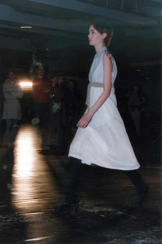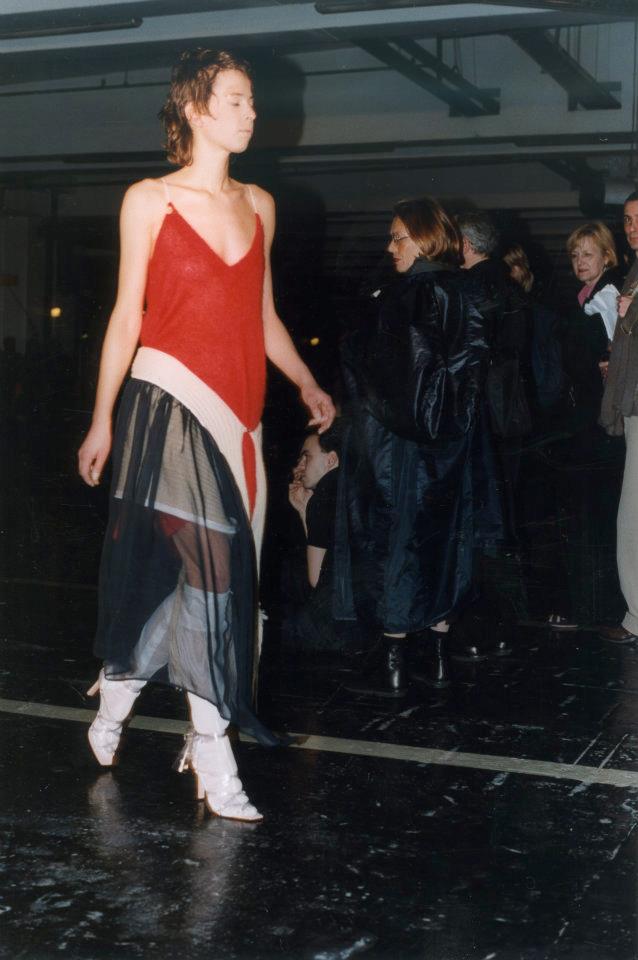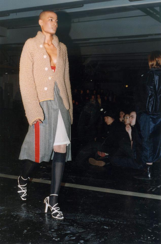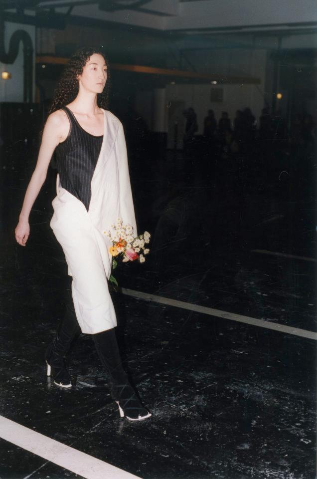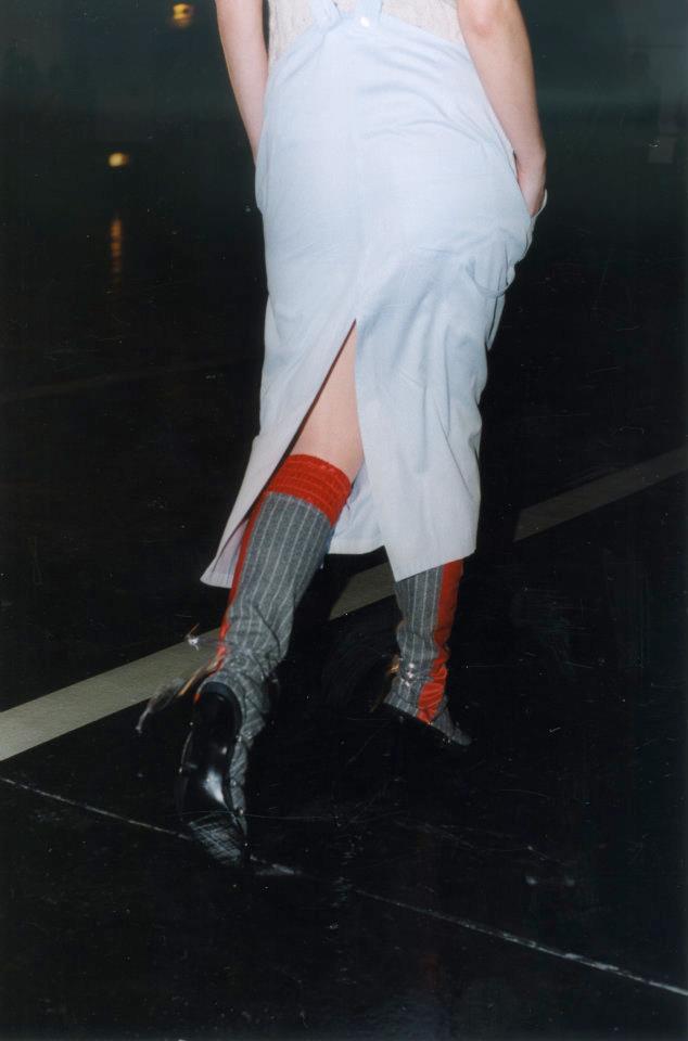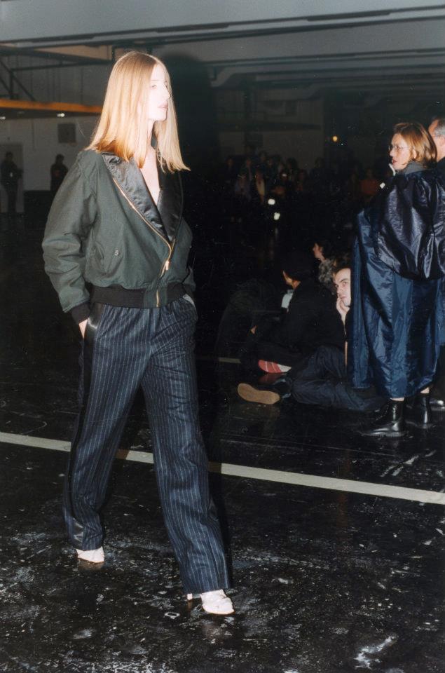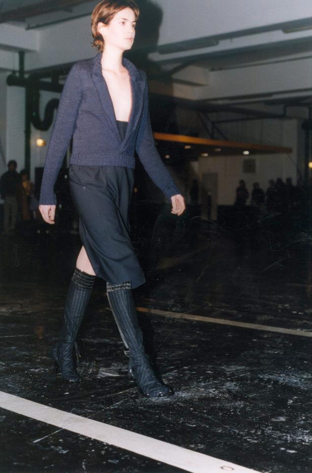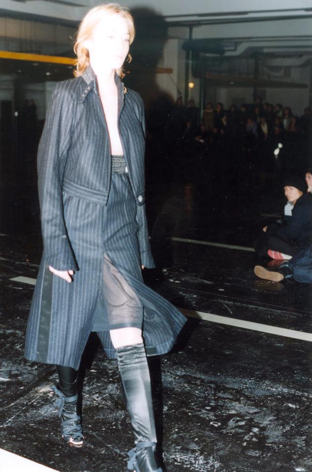 LUTZ HUELLE F/W 2001 “A SMOKING, SOME SPORTSWEAR, SOME WORKWEAR AND A BUNCH OF FLOWERS’ This took the work I’d done in the first two collections- the sportswear references, the Tuxedo, the high-waisted pants and skirts worn with low, plunging necklines , the idea of ‘taking something and doing it in the opposite way’ to its conclusion, and became very much a blueprint for all of the work that followed: A Tuxedo was cut in the shape of a Bomber, a Work-Overall was cut with lapels in shiny silk; Tuxedo pants had drawstrings like jogging trousers. A big woolen scarf had waterproof silk panels attached to it to be worn as a cape or overskirt. Thick knitted Cardigans in a Jacquard of Wool and Lycra were worn like Fur Coats, over tailored Blazers in Pinstripe Wool. Socks made with different fabrics of the collection were worn tied onto high heeled soles with plastic strings. The show took place in the Garage of the Centre Pompidou in Paris.