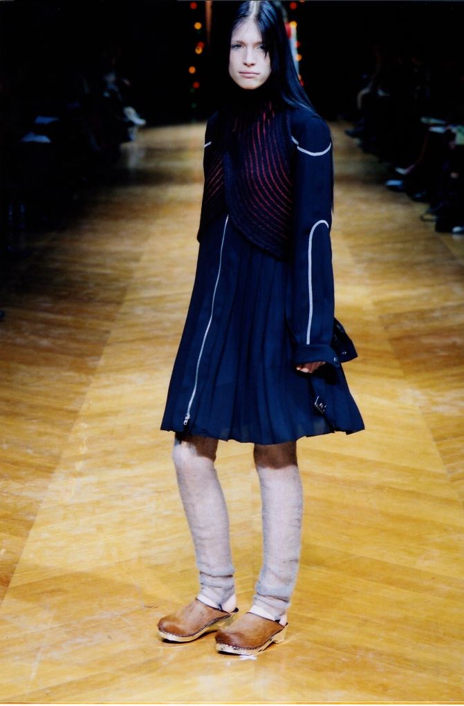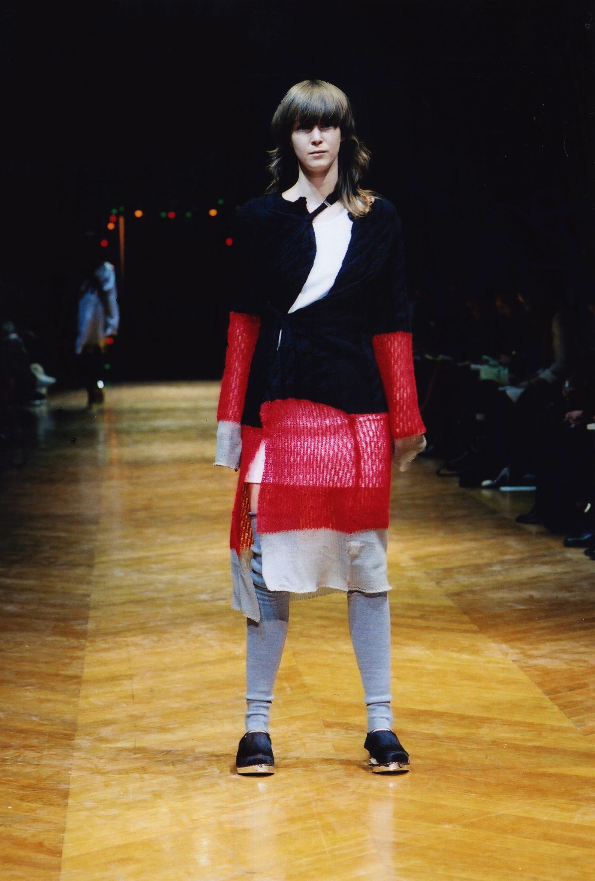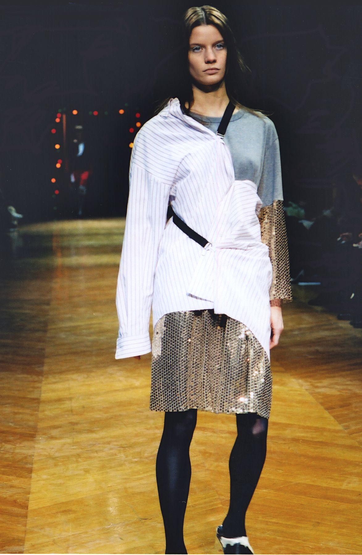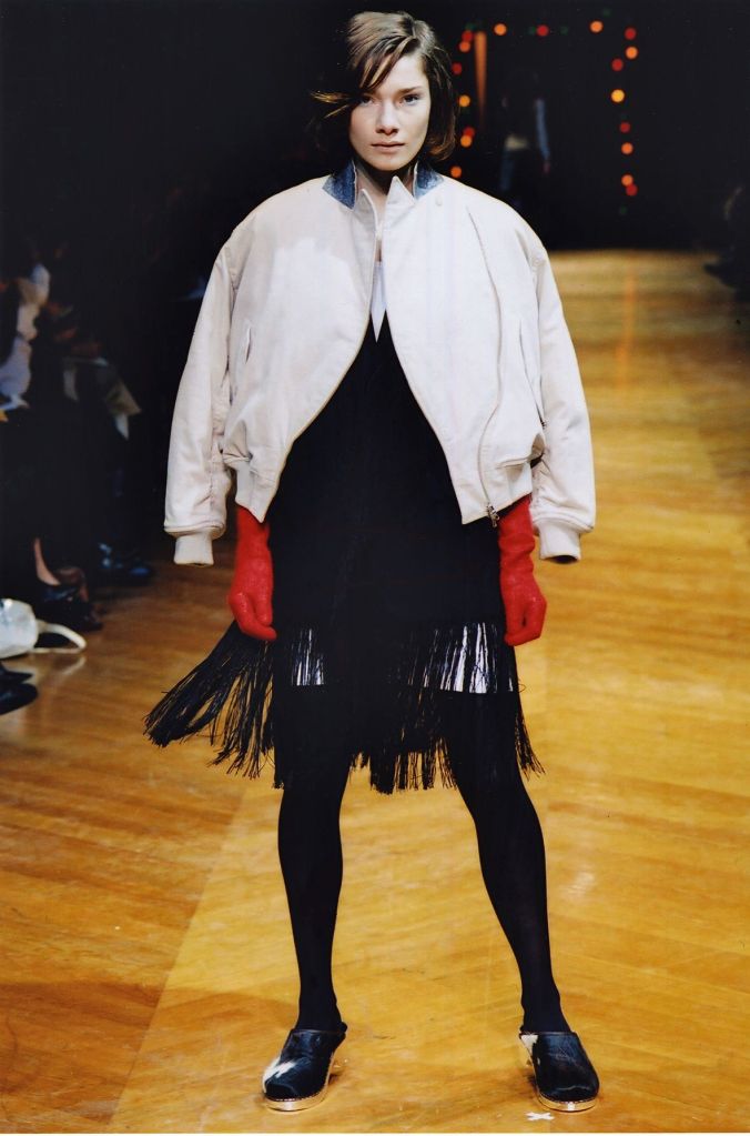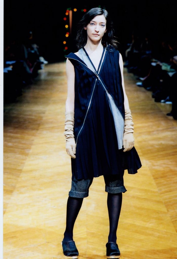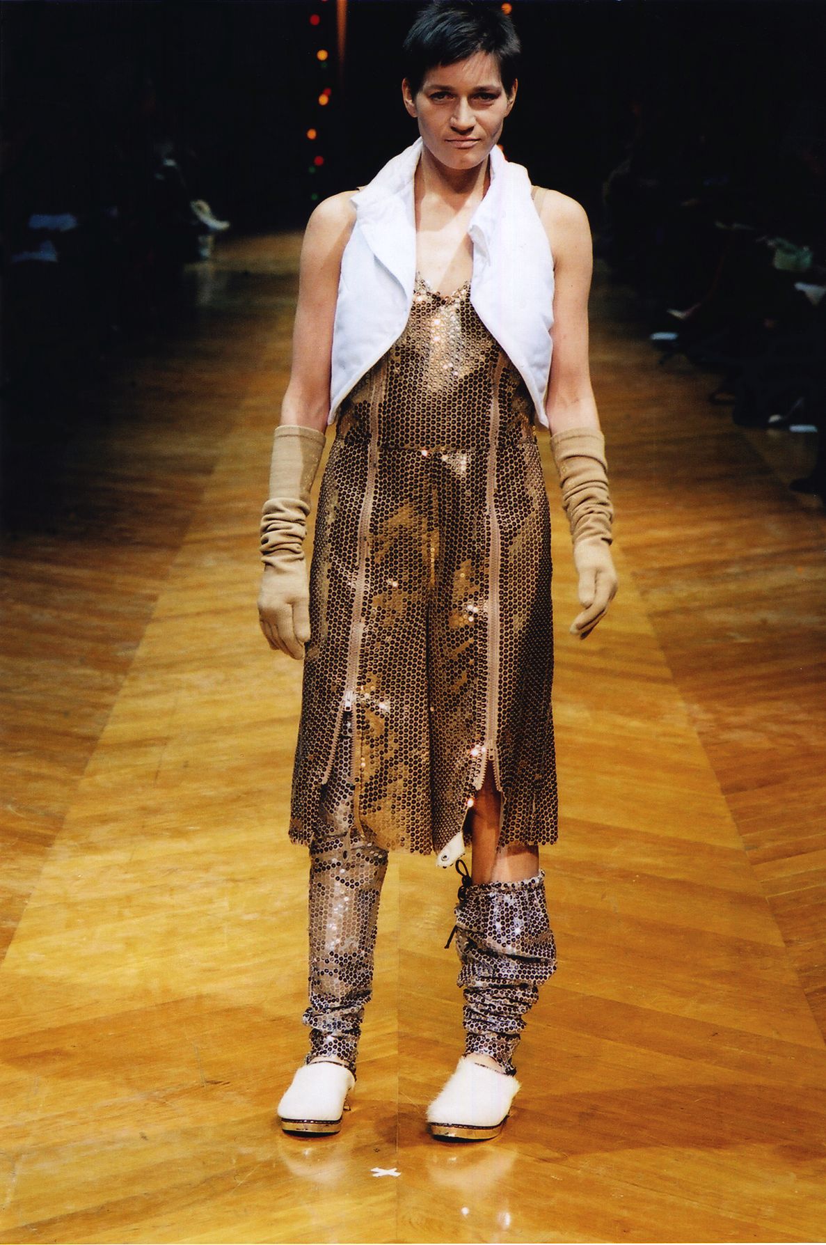LUTZ HUELLE NO.7 F/W 2003 ‘THE SMITHS AT THE DISCO’ Listening to The Smiths’ ‘The Queen is dead’ on repeat.. the idea of mixing Glitter and the Ordinary : a Men’s Blazer with Fringes, striped Shirting is worn with sequinned TShirts, Sweatshirts in grey Jersey have wide glittering hems. A striped Mohair Sweater is draped around the Body. I asked myself: ‘How can I put the aggressive, ‘street’ attitude of a Bomberjacket into a pleated dress? The result was this: I fixed some of the pleats so they didn’t move, cut the shape of a Bomber ( those pockets, the rib finishing) into the pleats as if it was a flat fabric, then left the rest of the pleats open to move freely. Ideas from this collection keep on coming up in later collections, especially the fixed/nonfixed pleats that I’m still using today.
