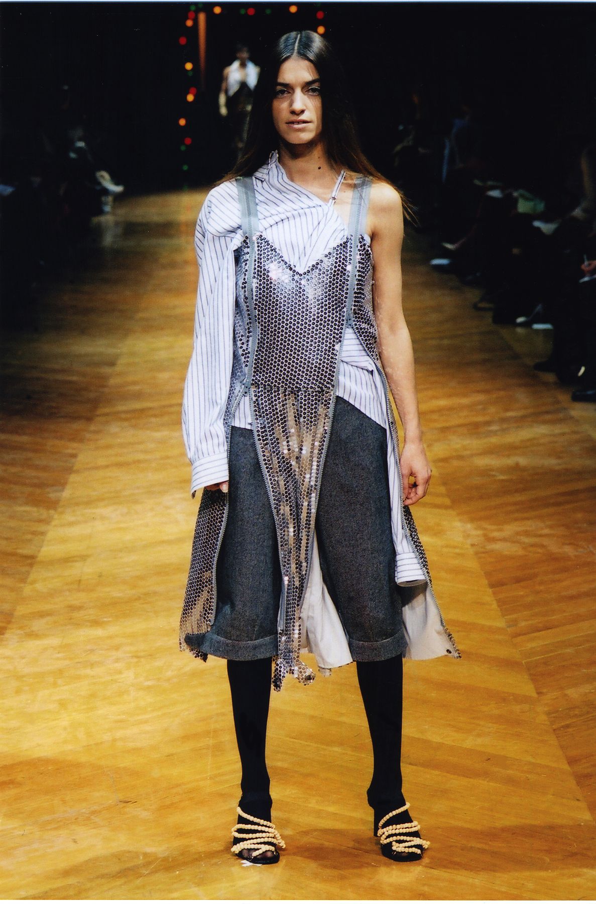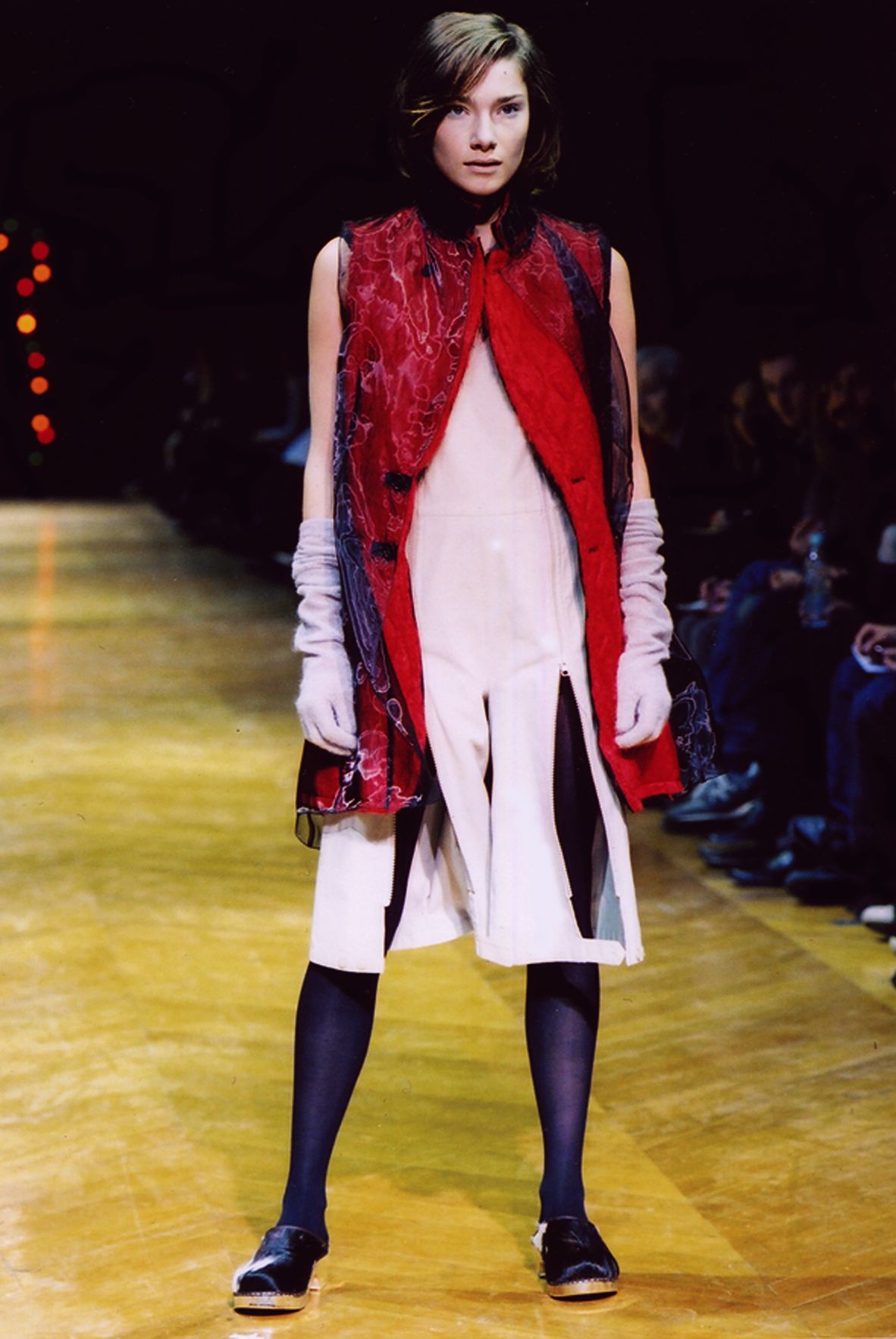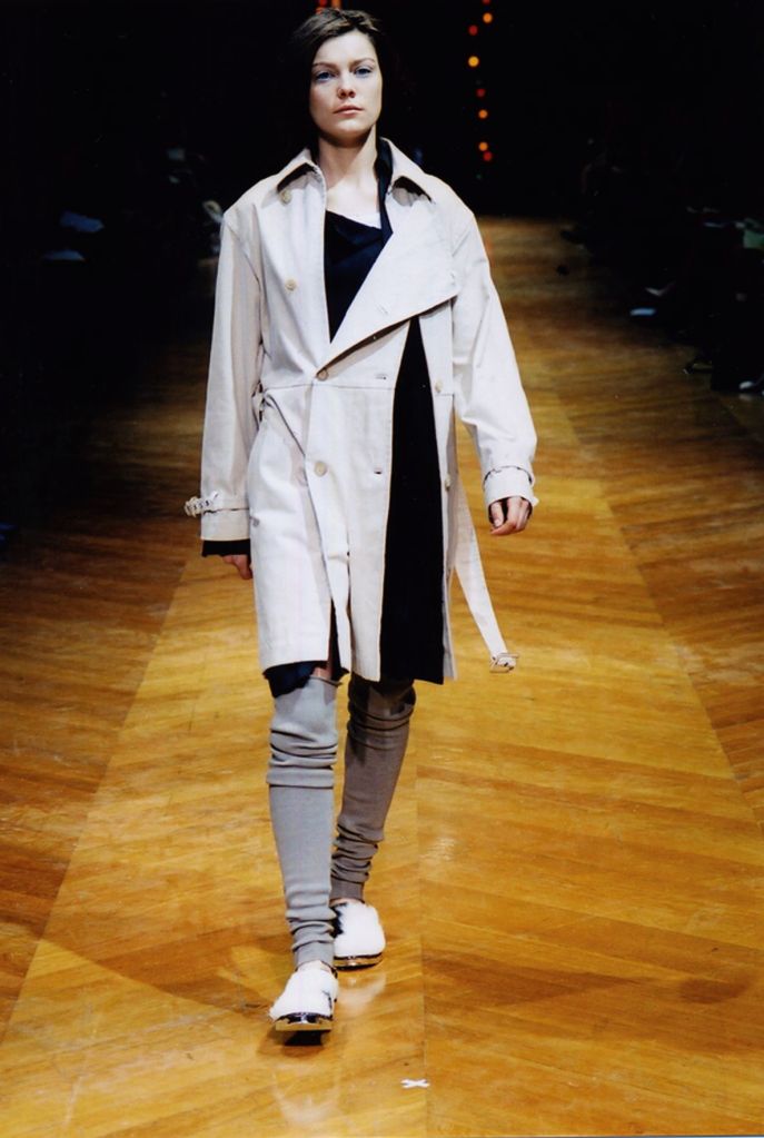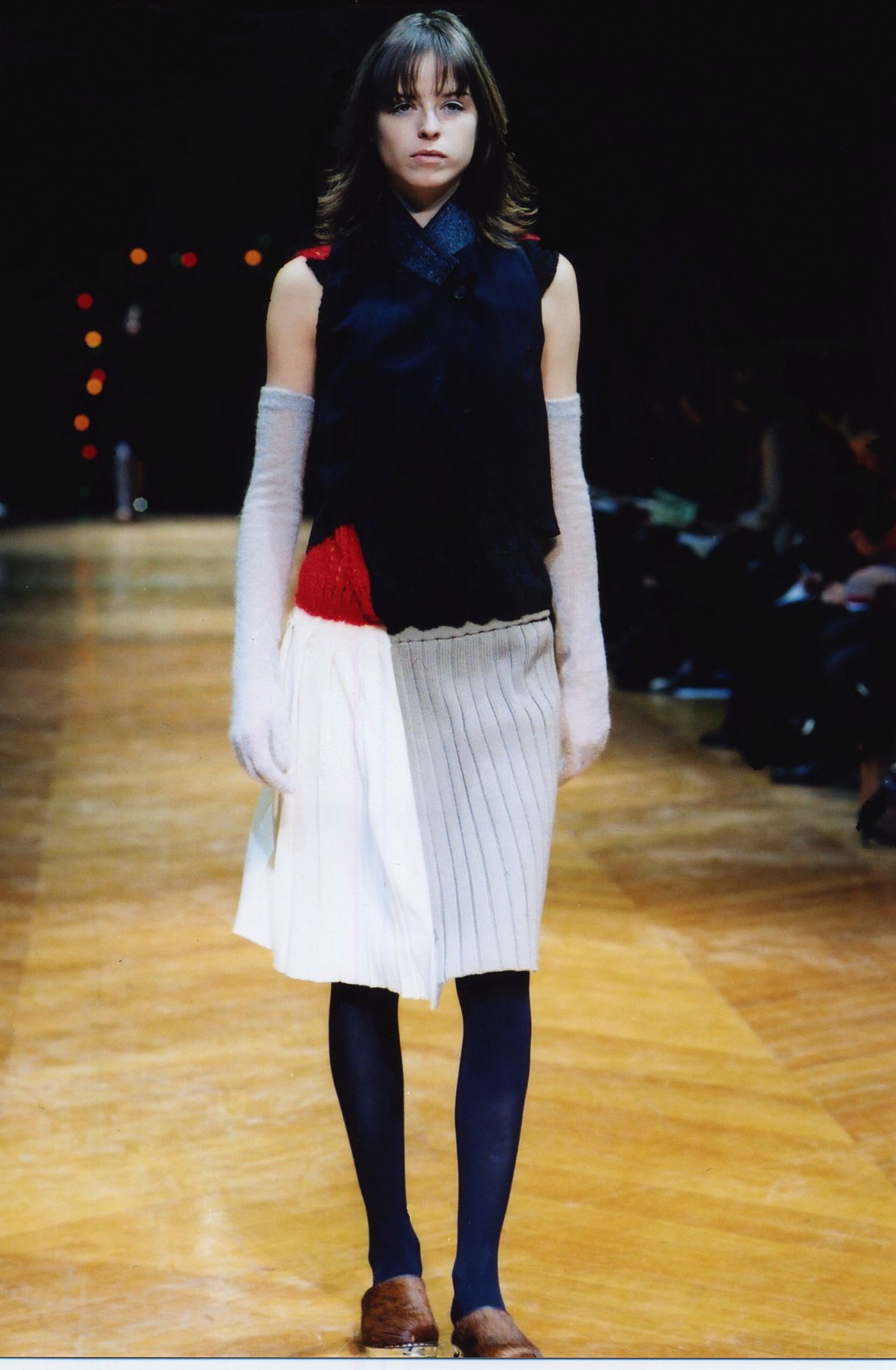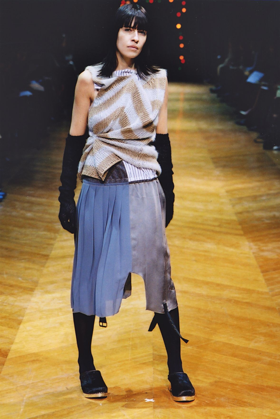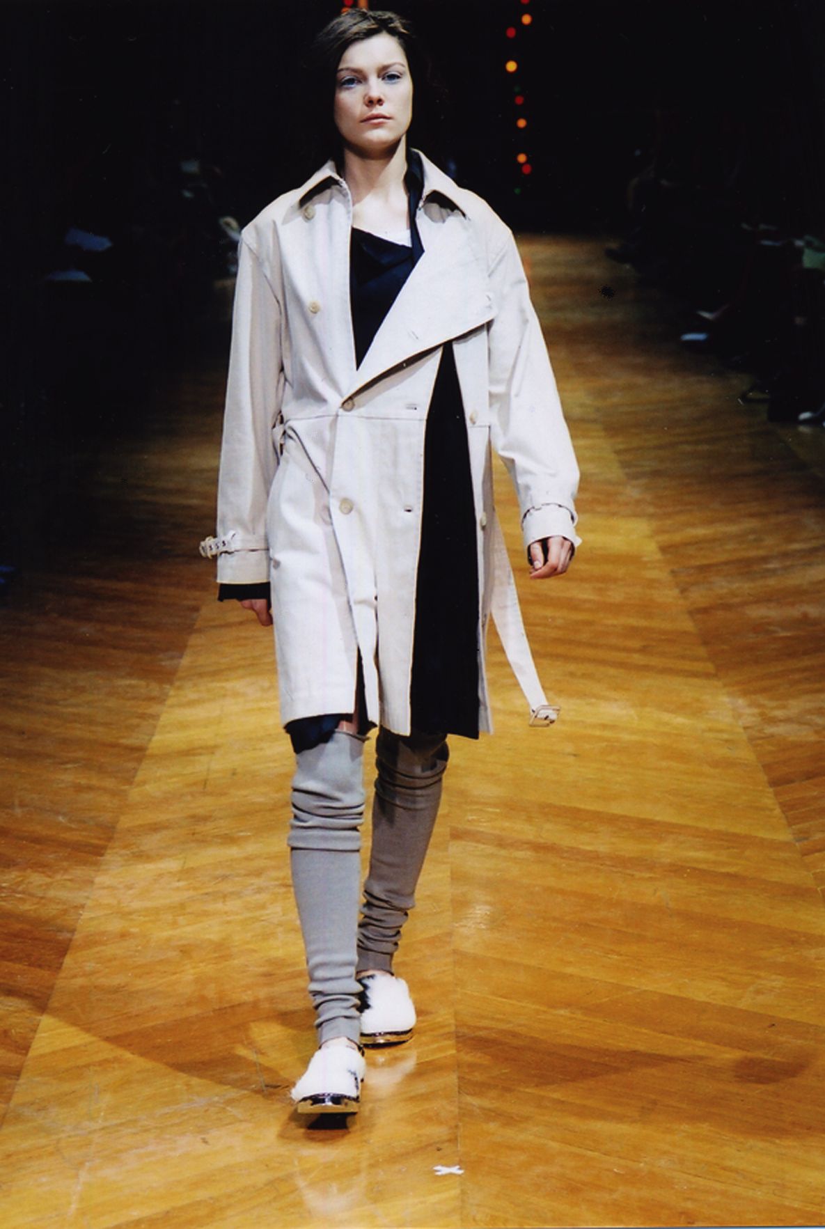 LUTZ HUELLE NO.7 F/W 2003 ‘THE SMITHS AT THE DISCO’ Listening to The Smiths’ ‘The Queen is dead’ on repeat.. the idea of mixing Glitter and the Ordinary : a Men’s Blazer with Fringes, striped Shirting is worn with sequinned TShirts, Sweatshirts in grey Jersey have wide glittering hems. A striped Mohair Sweater is draped around the Body. I asked myself: ‘How can I put the aggressive, ‘street’ attitude of a Bomberjacket into a pleated dress? The result was this: I fixed some of the pleats so they didn’t move, cut the shape of a Bomber ( those pockets, the rib finishing) into the pleats as if it was a flat fabric, then left the rest of the pleats open to move freely. Ideas from this collection keep on coming up in later collections, especially the fixed/nonfixed pleats that I’m still using today.
