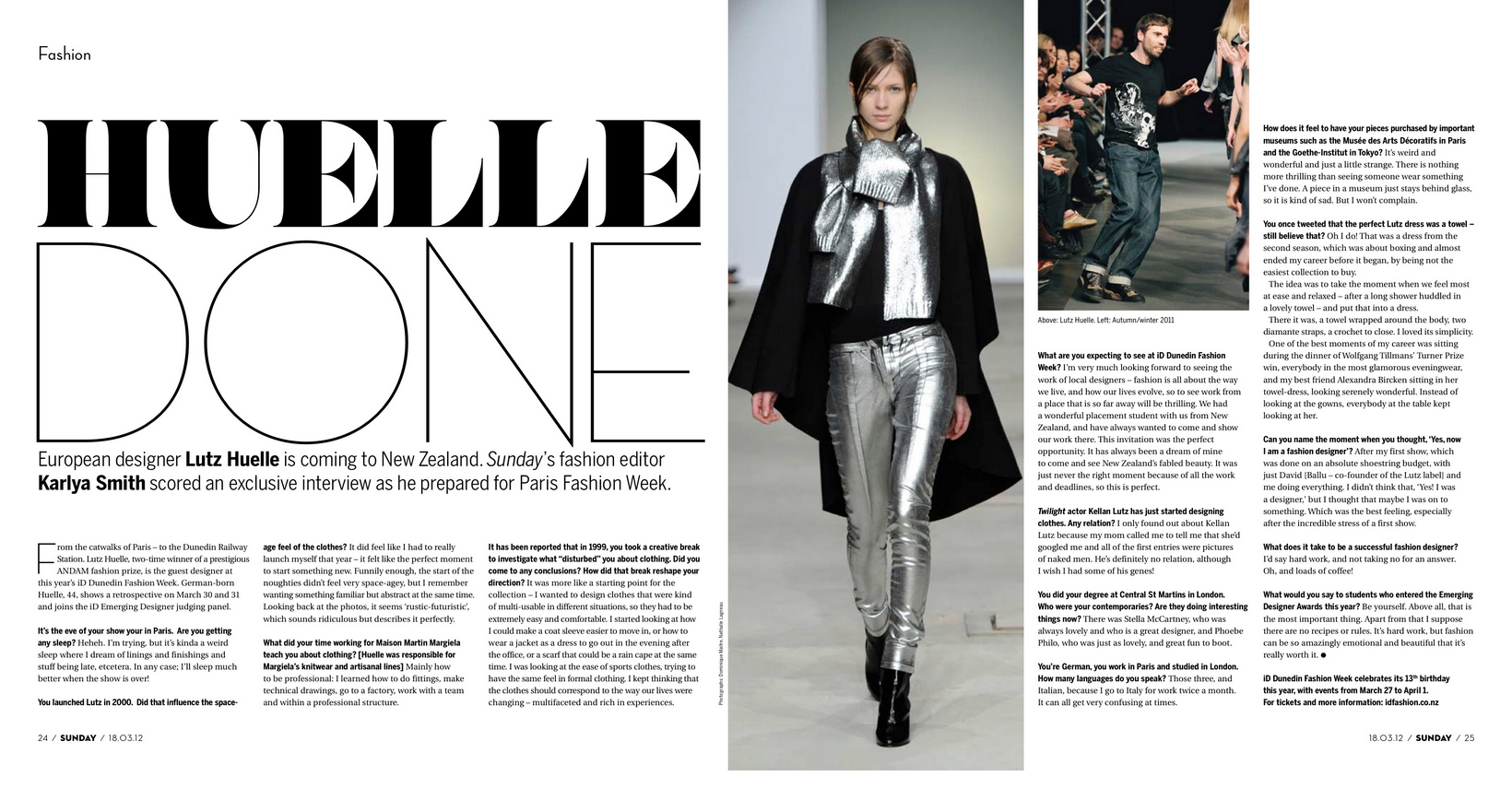 Karlya Smith on LUTZ HUELLE in SUNDAY MAGAZINE, New Zealand