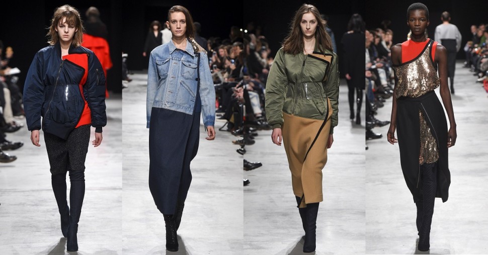 Pour l’hiver prochain, Lutz Huelle a détourné les bombers. Il n’a pas fait que ça mais ces vestes militaires, il en fait des manteaux prolongés par trompe l’oeil. Ensuite, il leur a appliqué des serre-tailles en plastique transparent, pour marquer les hanches sous couper la ligne du vêtement. C’est malin. Il a aussi assemblé des vestes en jean à des robes, qui s’ouvrent désormais sur le côté. La pièce la plus effortless du monde devient une leçon d’architecture. Des cols il a fait des capuches. De tubes en filets, il a accouché des accessoires qui modifie la ligne d’horizon de la silhouette. Il a recouvert des cuissardes chaussettes de sequins, joué sur les pliages pour redéfinir les lignes sans ajouter d’épaisseurs, fait de l’oversize au niveau des “détails”, pour qu’il reste seyant. Tout en subtilité, au delà d’une collection, Lutz Huelle a créé une attitude.