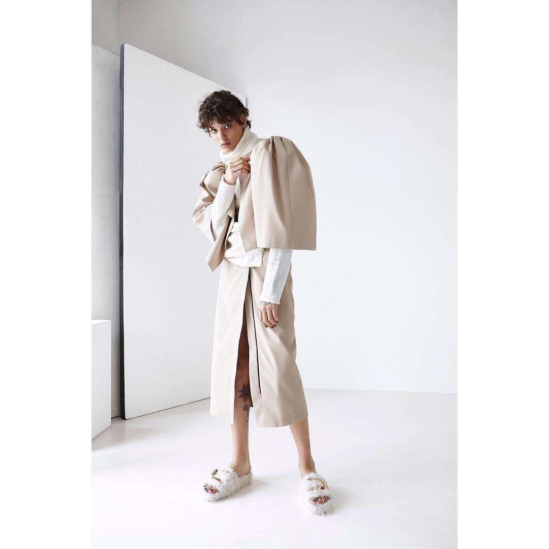 Lutz Huelle Oversleeve Trench Jacket and Zipped Skirt in VOGUE BRAZIL , styled by Sarah Cazeneuve, photo by Ricardo Brahao
