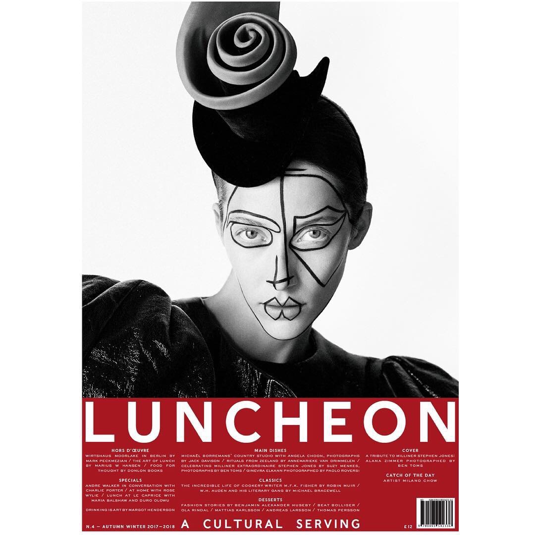 “One of our four covers for Luncheon no 4! Celebrating milliner Stephen Jones with his selection of 12 hats from his archive up to today. Stephen in conversation with Suzy Menkes. Photographs by Ben Toms. Styling by Mattias Karlsson. Model Alana Zimmer. Makeup by Lucy Bridge. Hair by Mari Ohashi. Jacket by Lutz Huelle @stephenjonesmillinery @suzymenkesvogue @ben_toms @omattias @zimzimzimmer @lucyjbridge @marimarilondon @polly_setdesign @lutz_huelle 🍷”