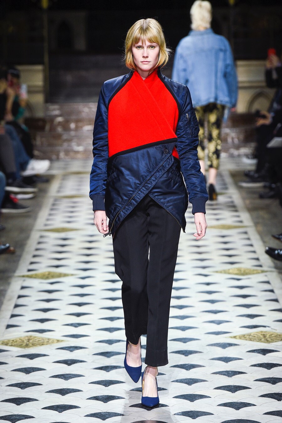 ‘Lutz Huelle had an emotional time looking around the Martin Margiela retrospective which opened at the Musée Galliera the other day. It reminded him most strongly of how his onetime boss “saw beauty in everything. Nothing was insignificant or without the potential for beauty, even a stupid plastic bag.” Huelle’s work doesn’t appear to be visibly influenced by Margiela, but he does seem on a mission to make ordinary life a little more enjoyable. In this collection, he interrupted some banal, generic clothes by inserting patches of rich brocade or traditional wool into them, thus knocking their volumes off center. Regular parkas and a jean jacket became wrap-over shapes. The internal padded quilting of coat liners came to the surface and was fused with knitwear or a denim shirt.