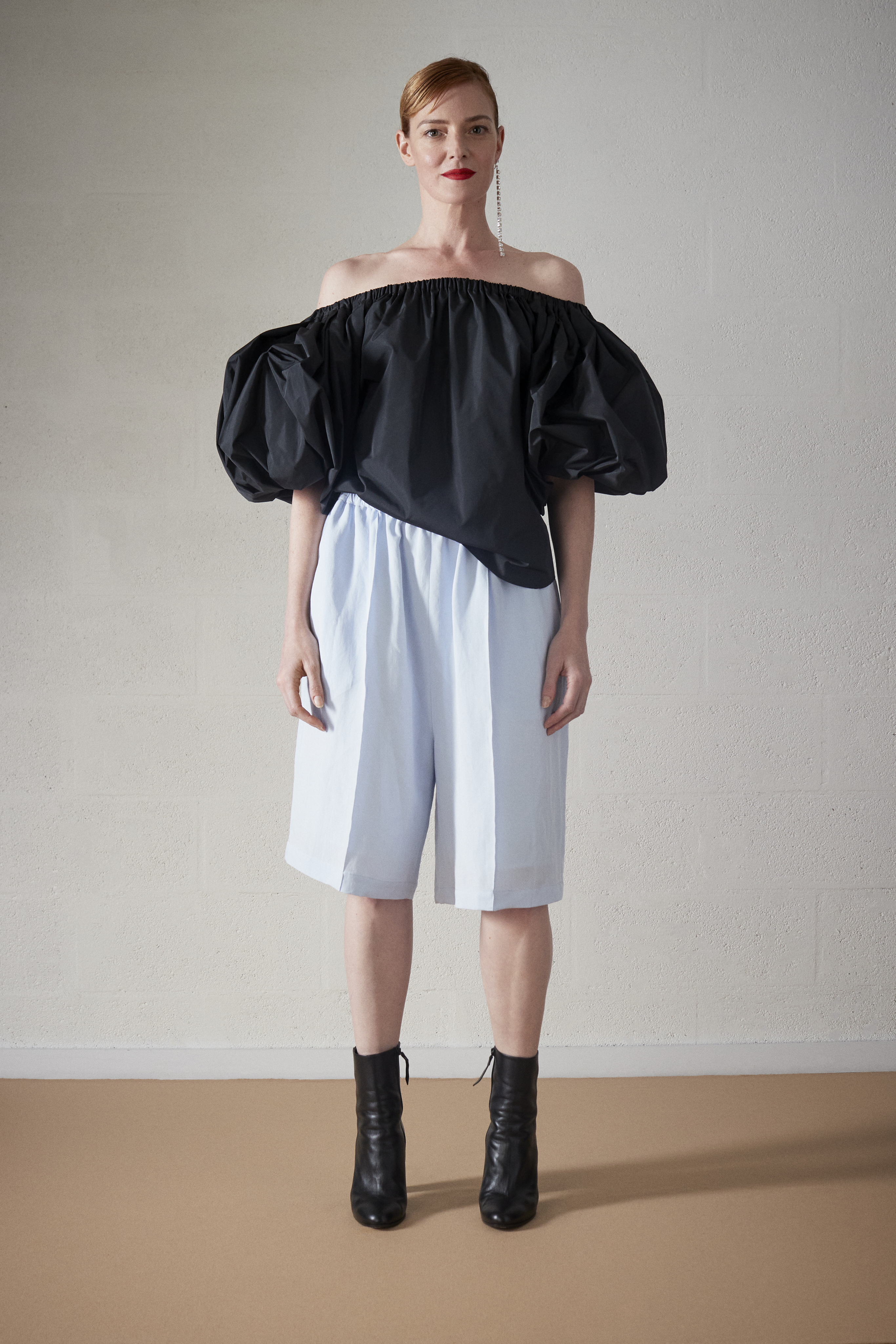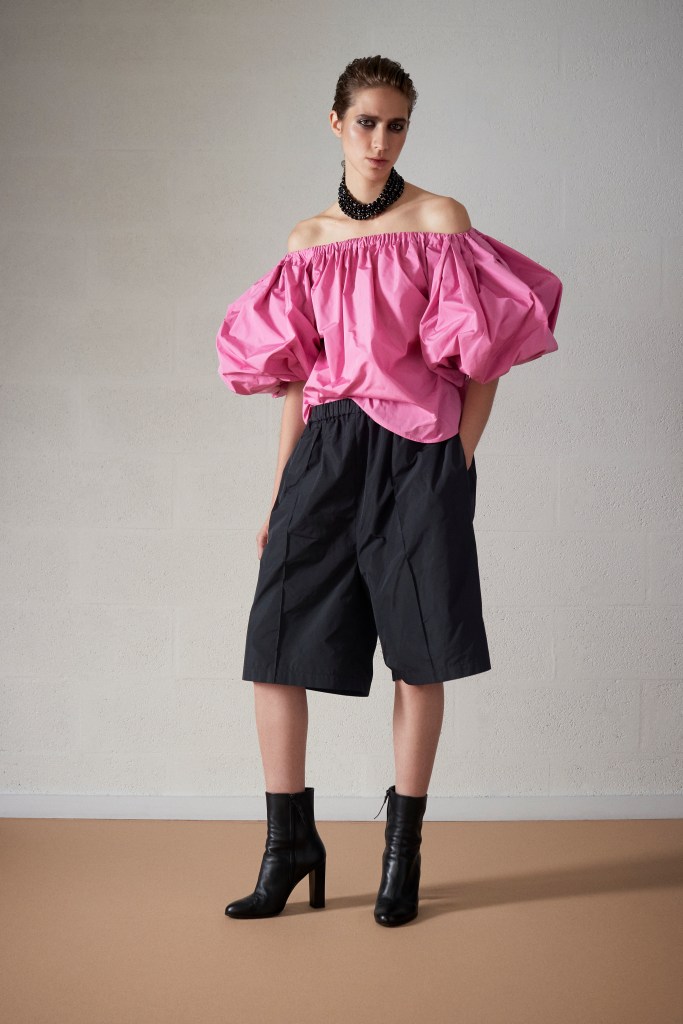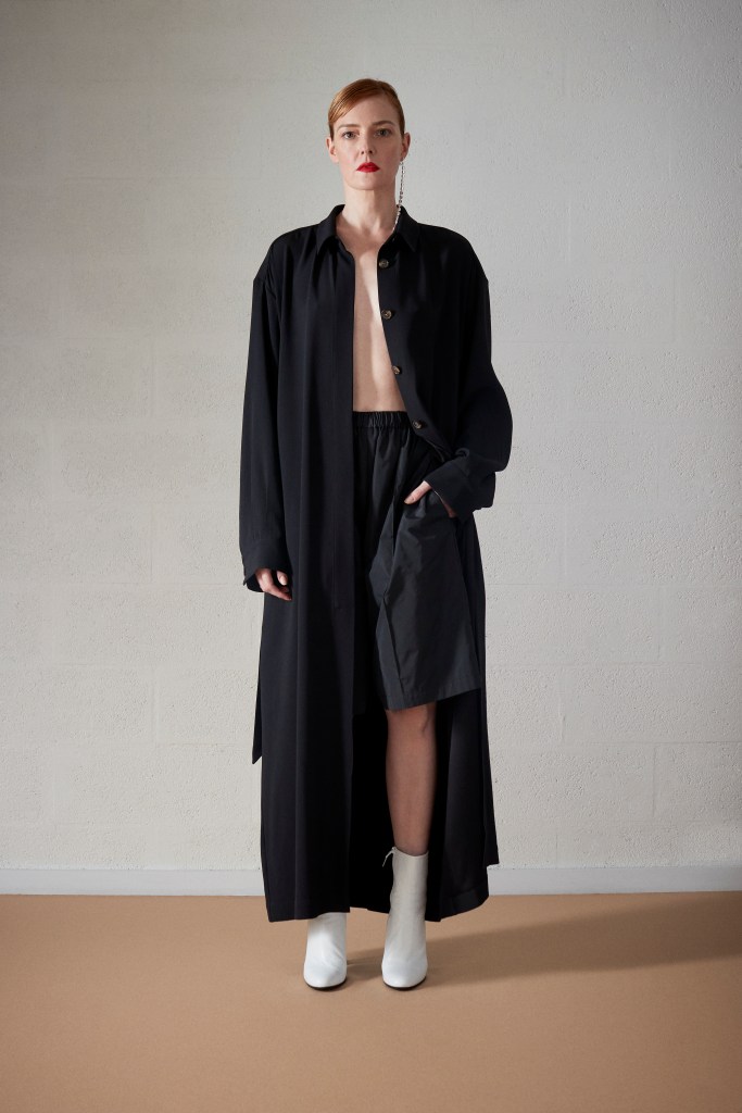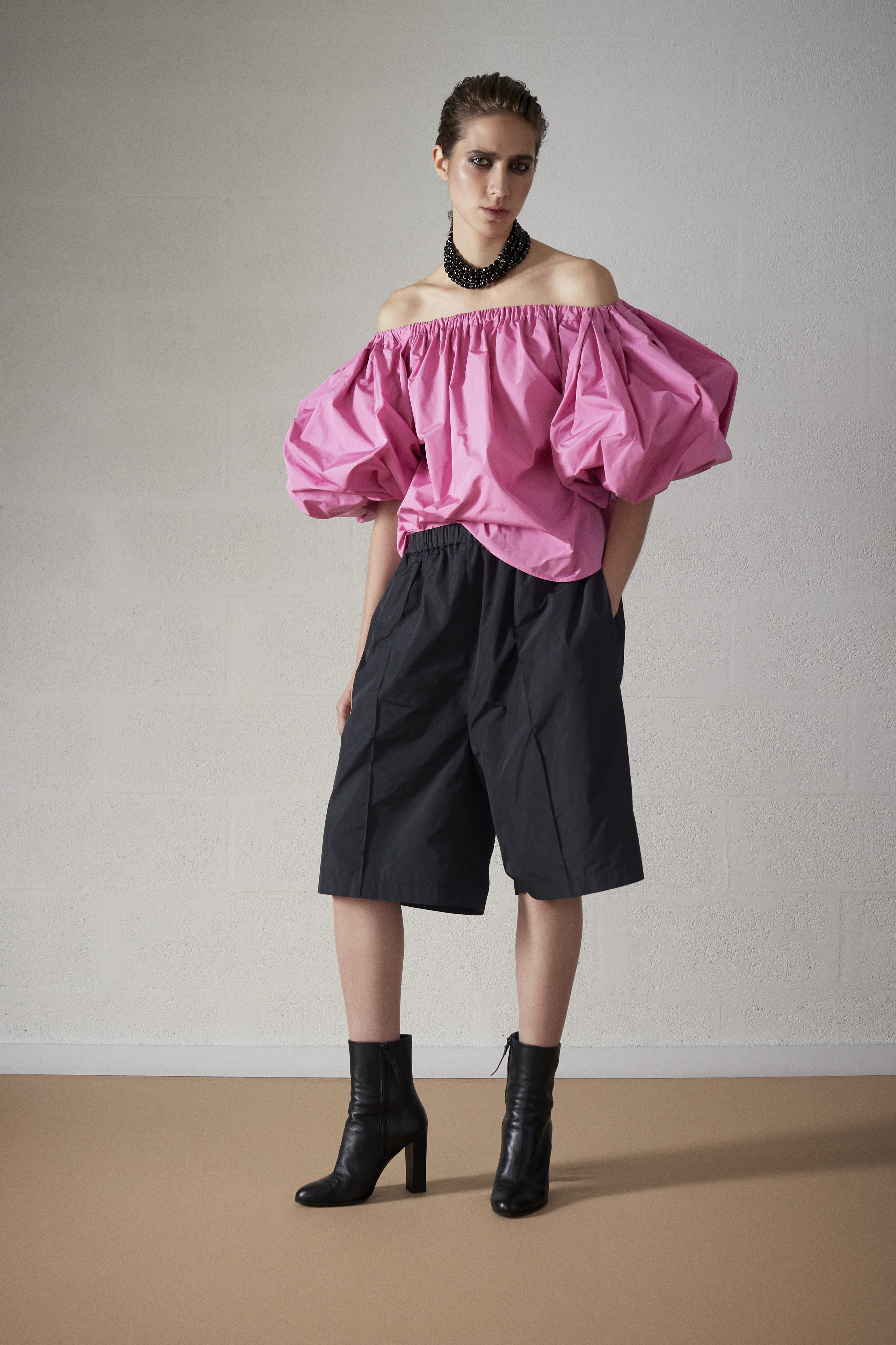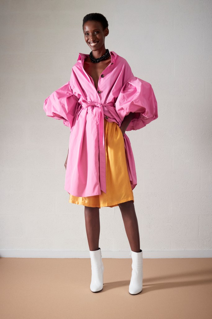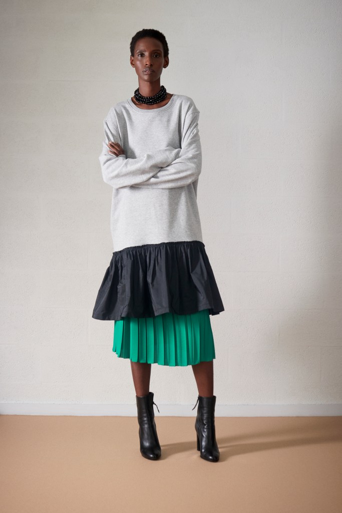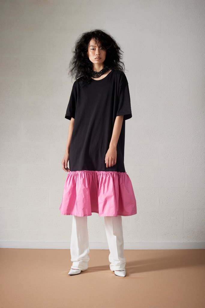 A bathrobe with hydrangea-shaped sleeves is cut in a featherlight taffetas and can be worn either at home with very little underneath, or outside as a dramatic coat. The same taffetas is fixed as a gathered hem on T-shirts and Sweatshirts, turning them into relaxed cocktail dresses.