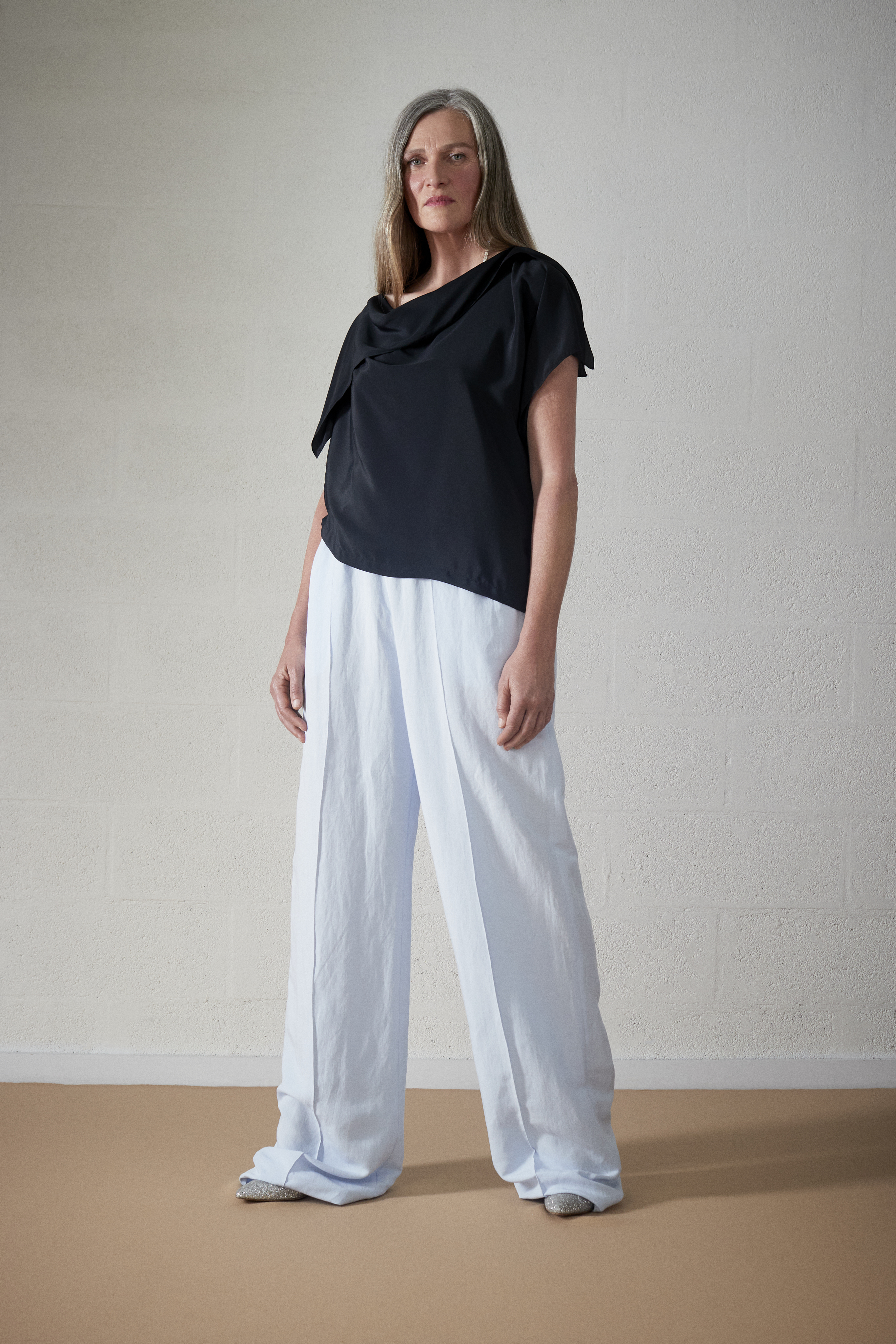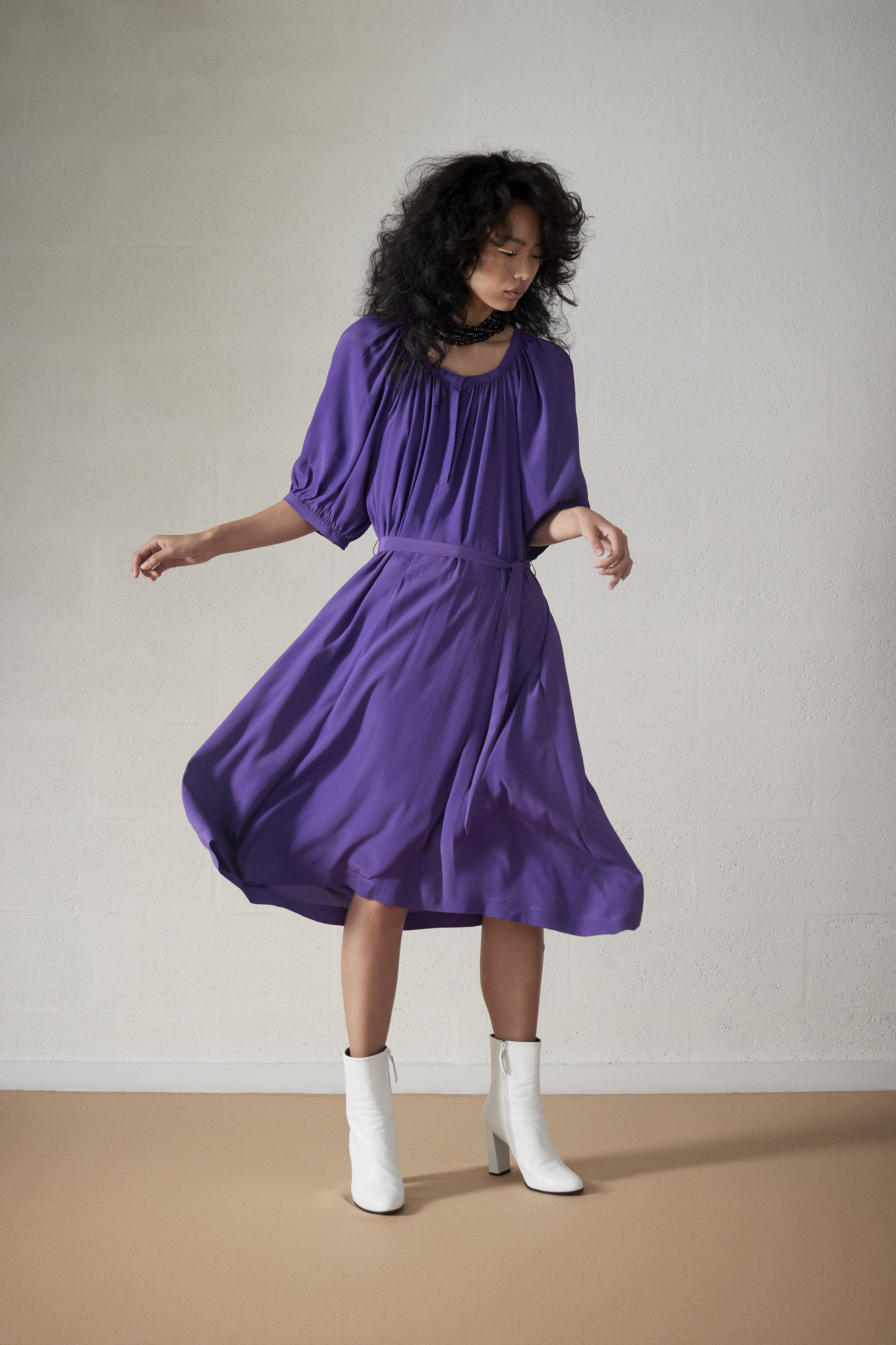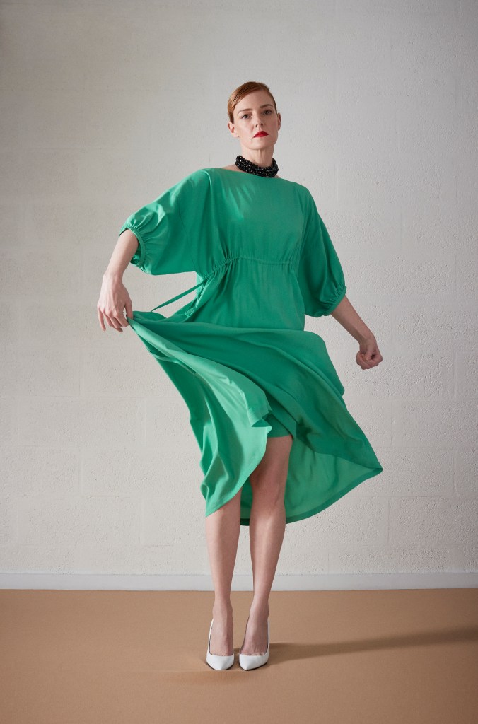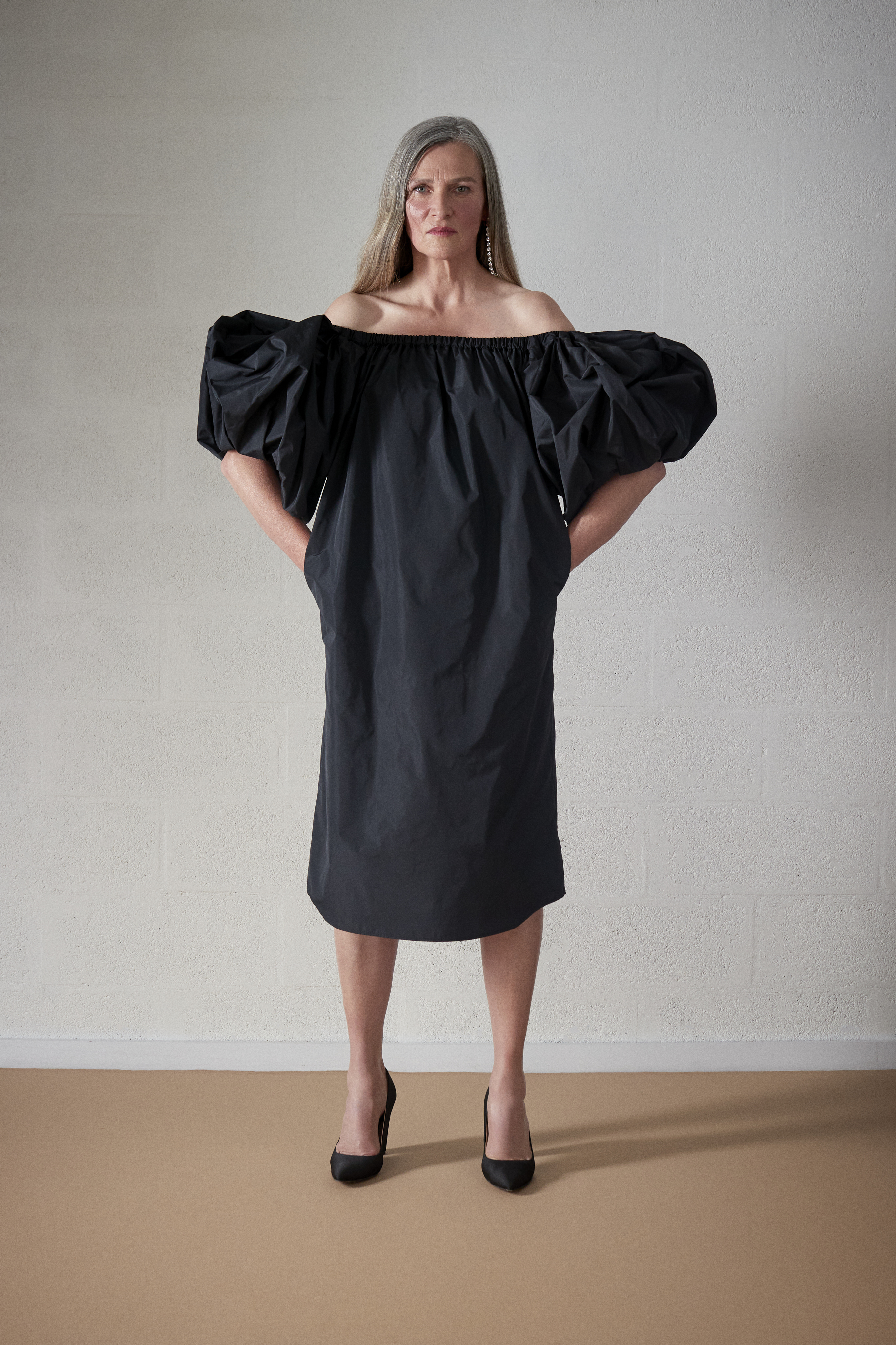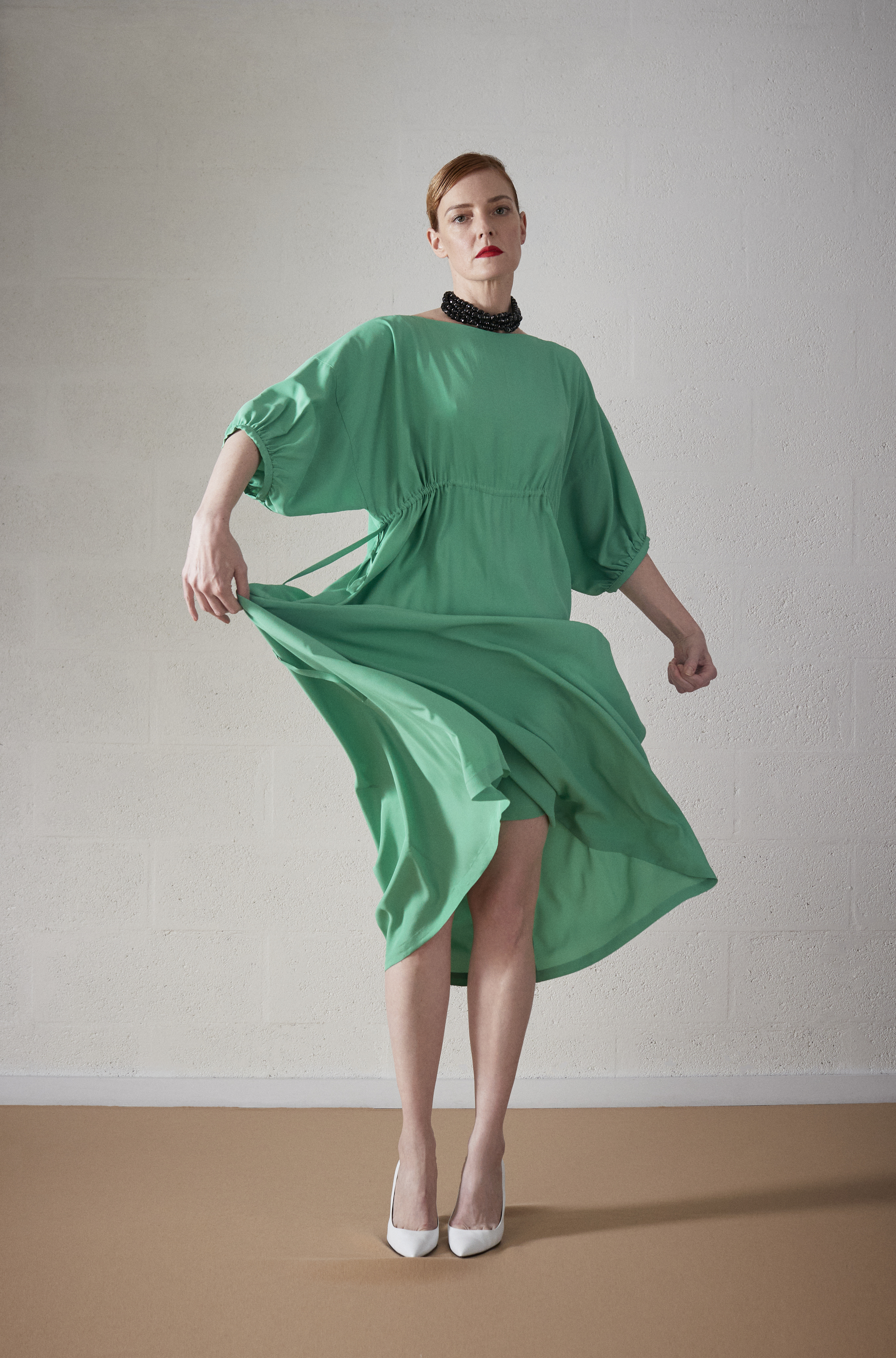 A bathrobe with hydrangea-shaped sleeves is cut in a featherlight taffetas and can be worn either at home with very little underneath, or outside as a dramatic coat. The same taffetas is fixed as a gathered hem on T-shirts and Sweatshirts, turning them into relaxed cocktail dresses.