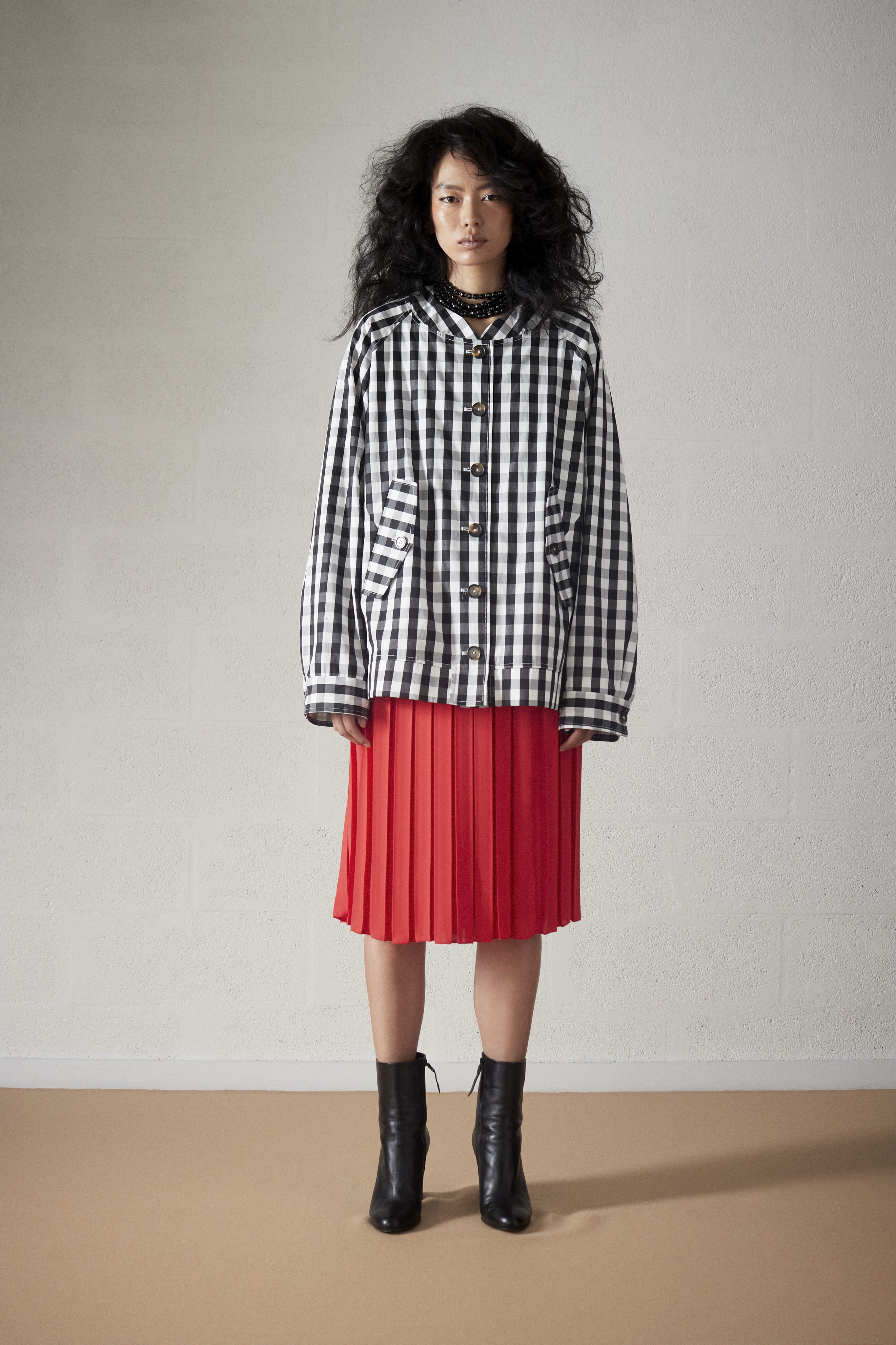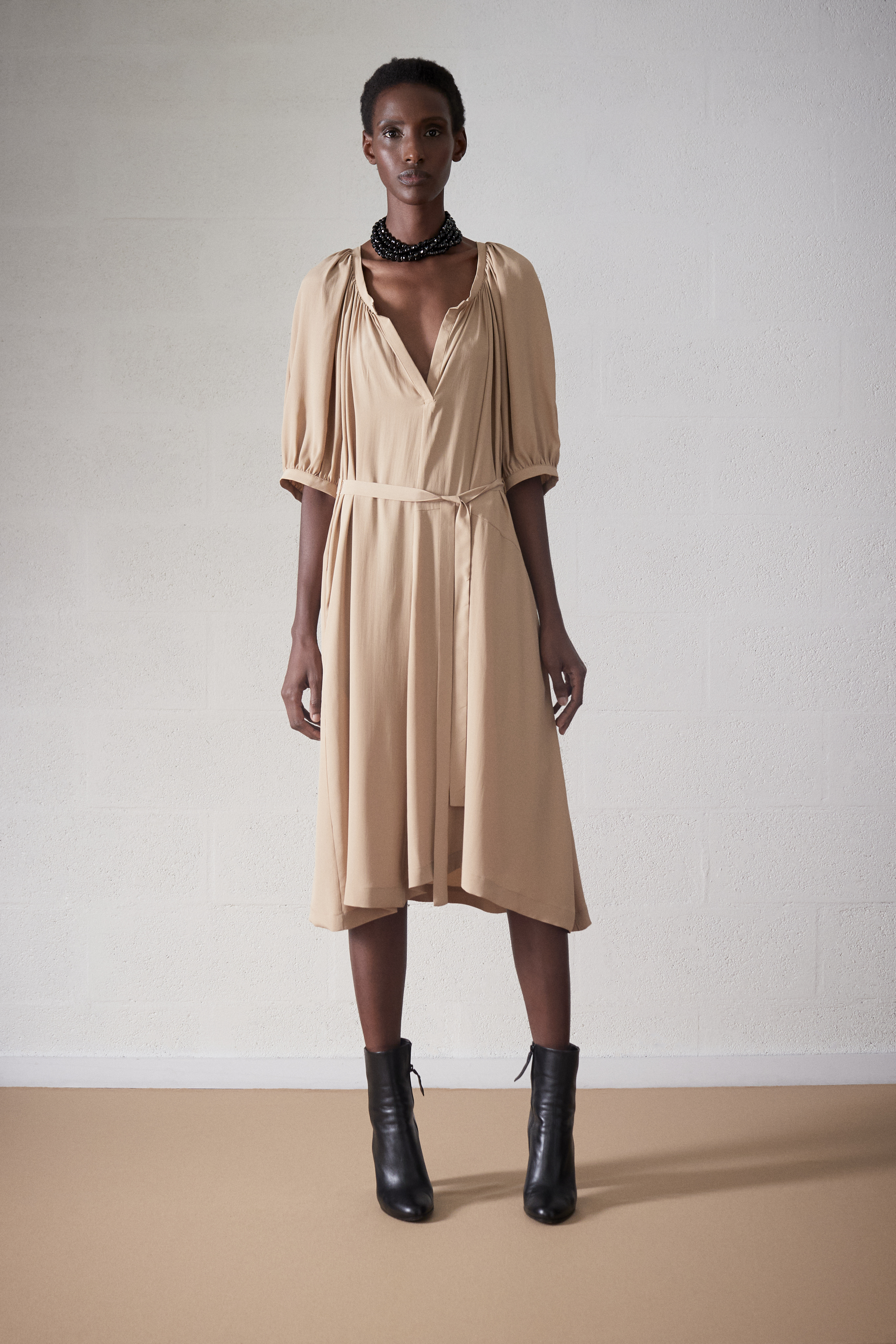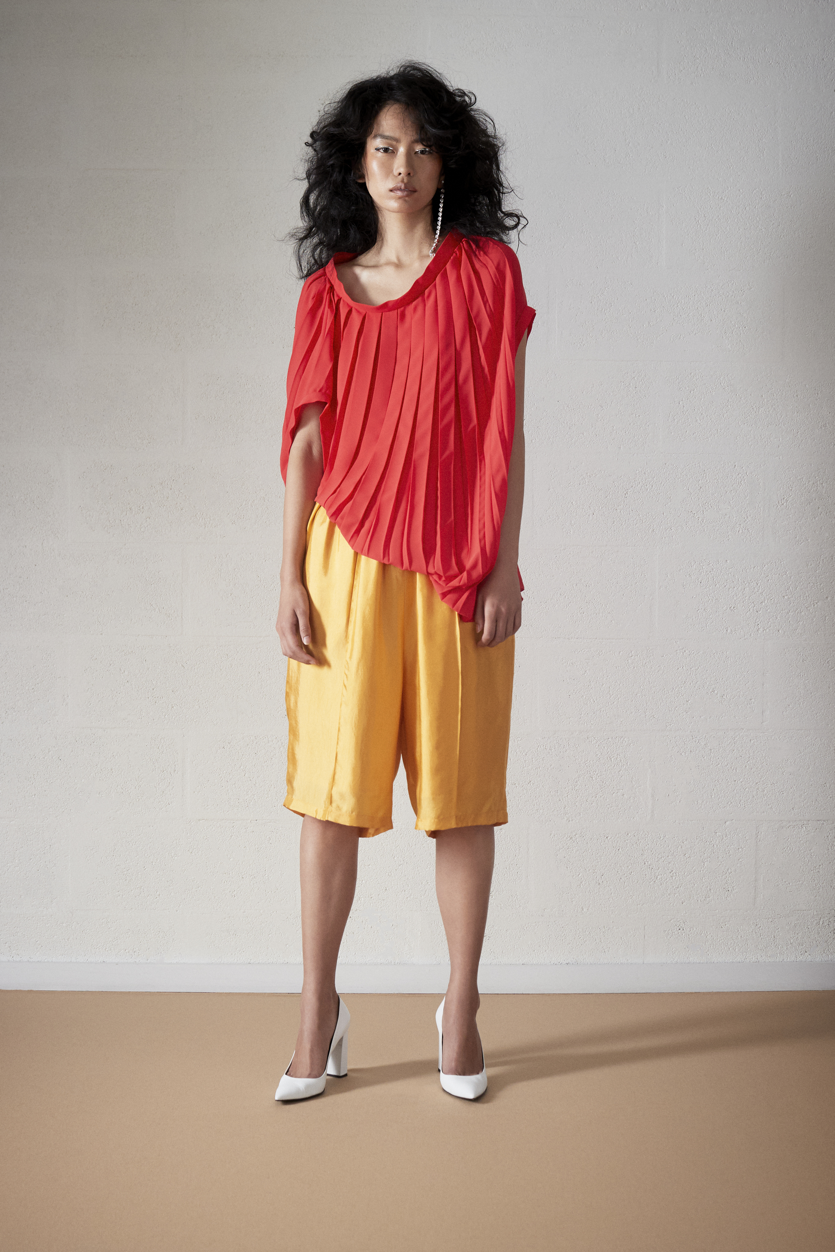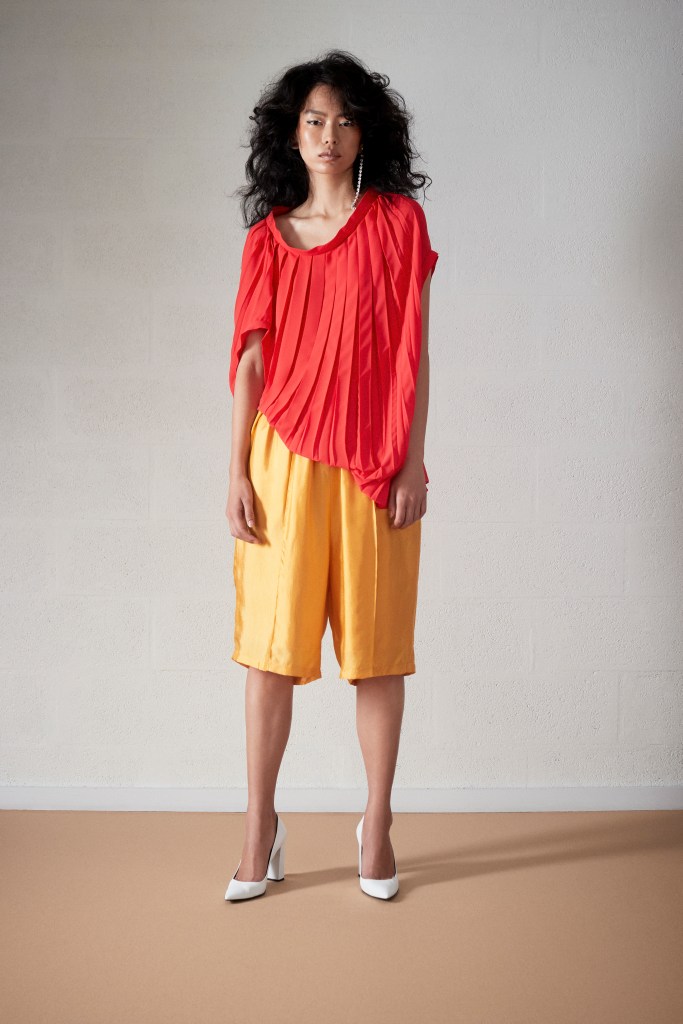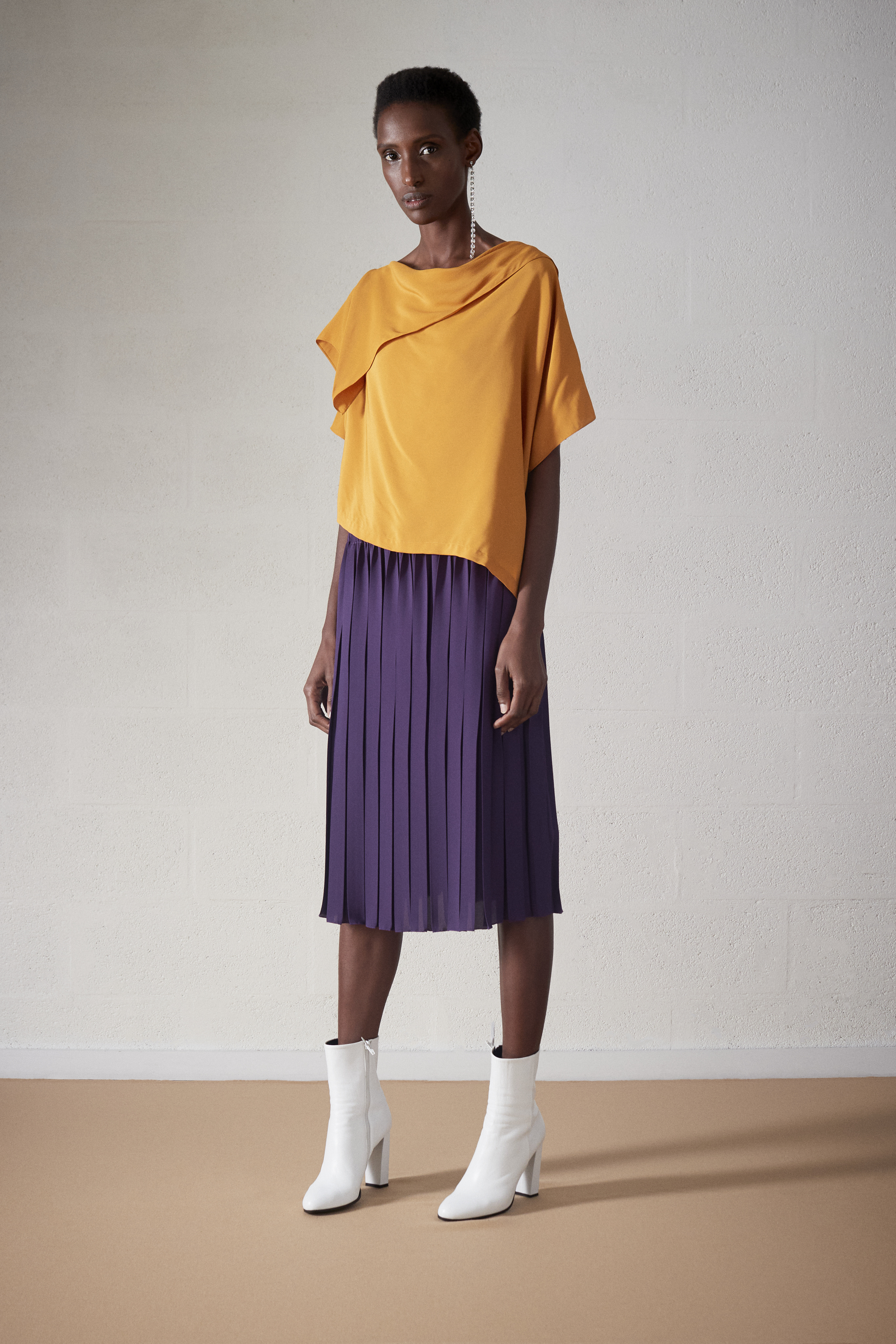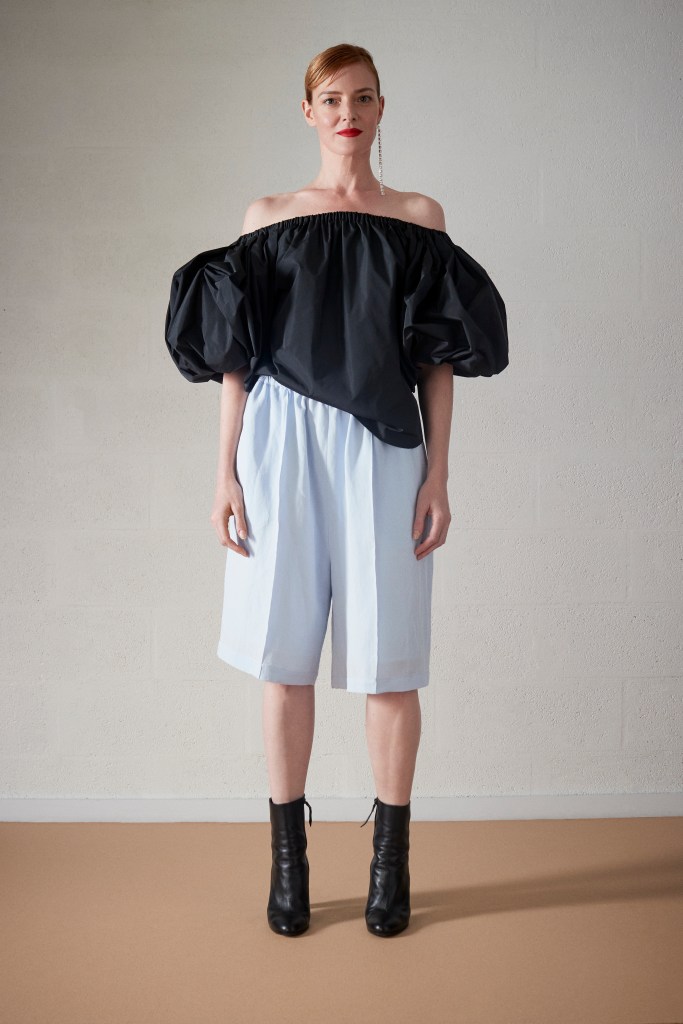 A bathrobe with hydrangea-shaped sleeves is cut in a featherlight taffetas and can be worn either at home with very little underneath, or outside as a dramatic coat. The same taffetas is fixed as a gathered hem on T-shirts and Sweatshirts, turning them into relaxed cocktail dresses.