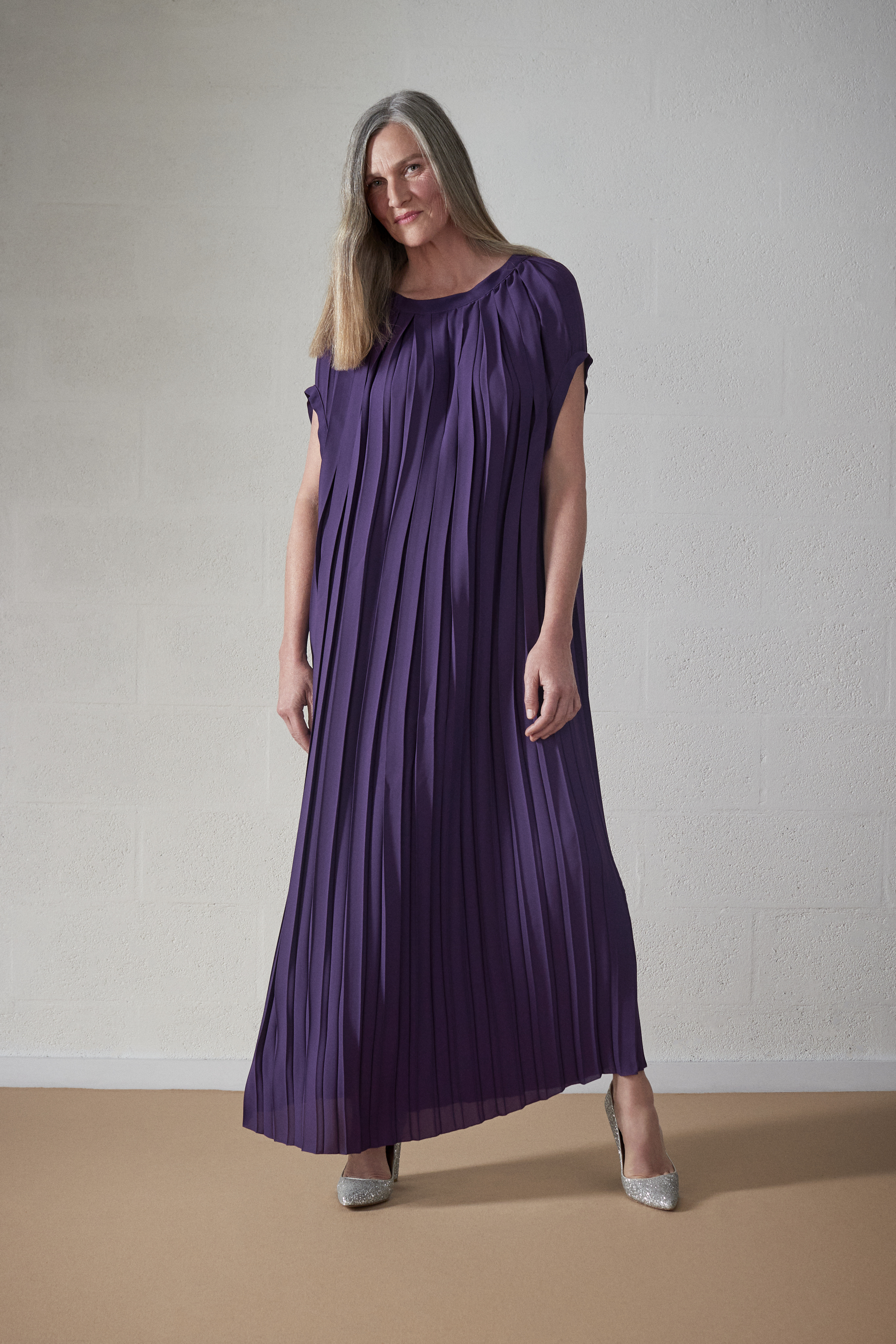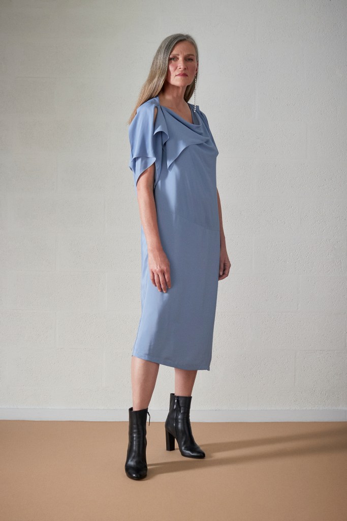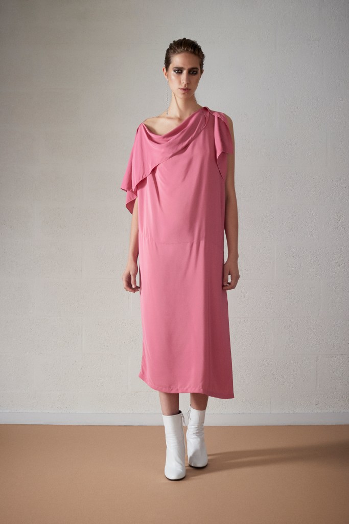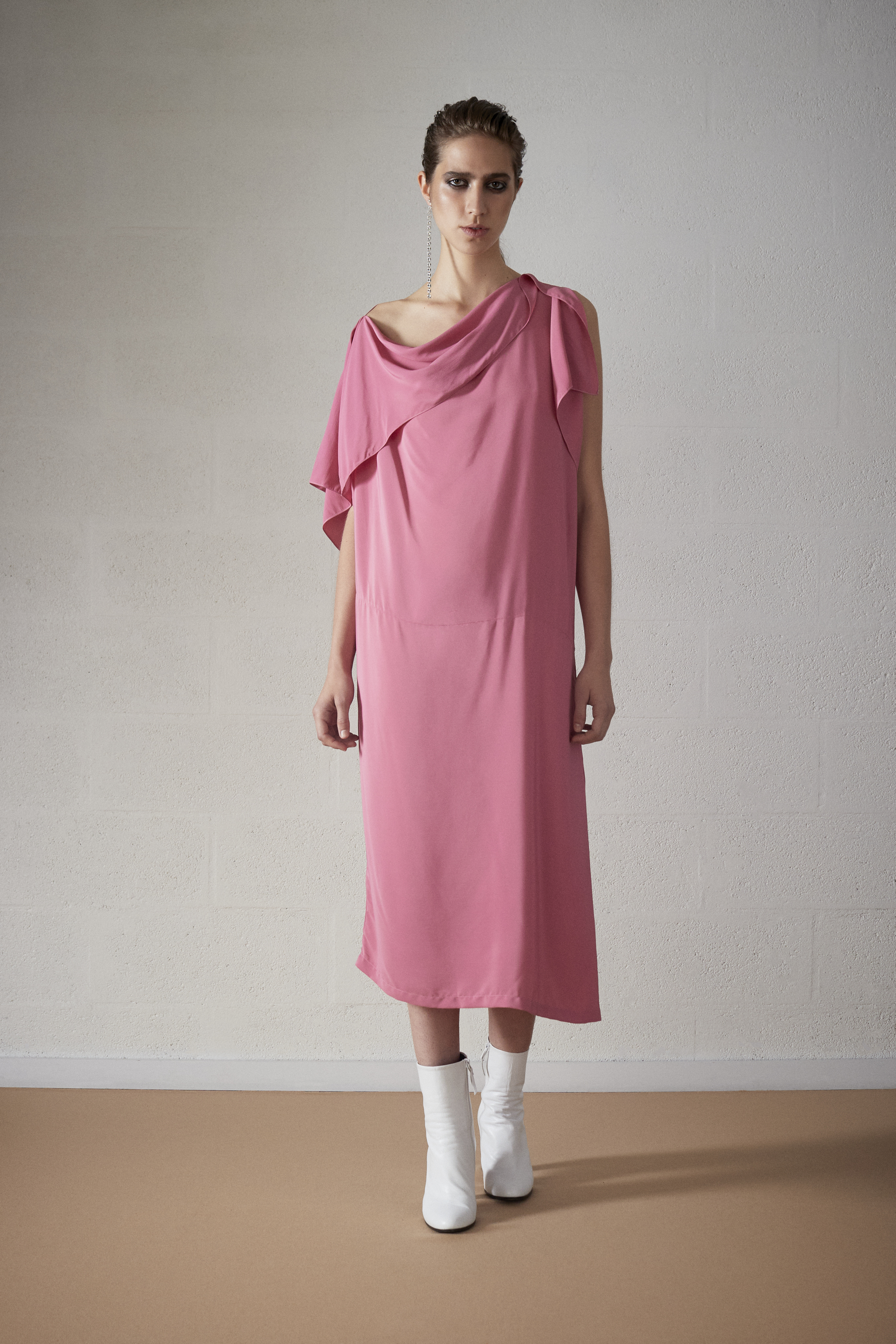 Squares of fluid silk are fixed at irregular points at the shoulders and drape over the neck and arms in a sensual, random way.