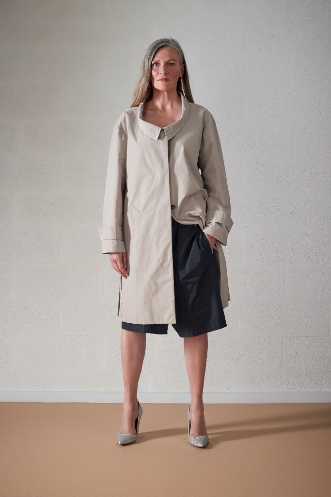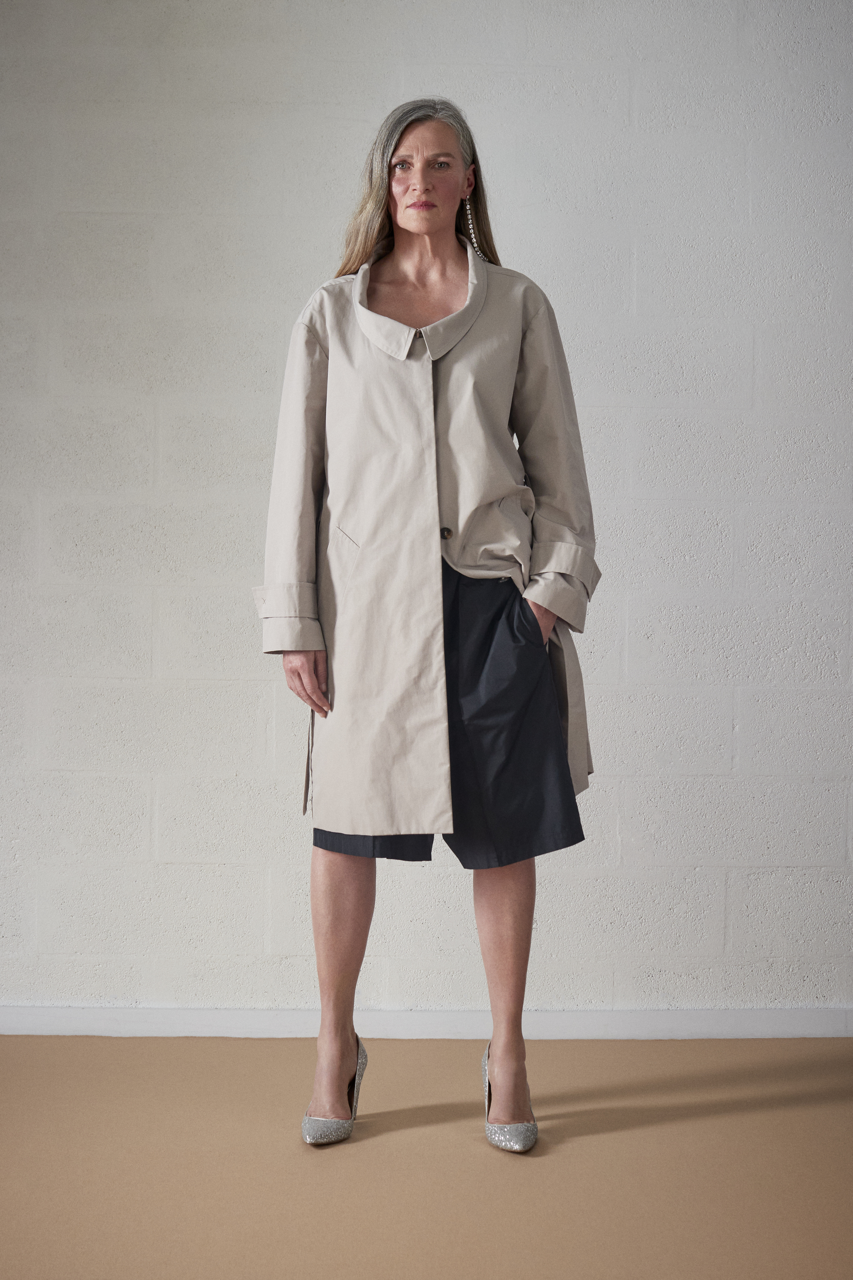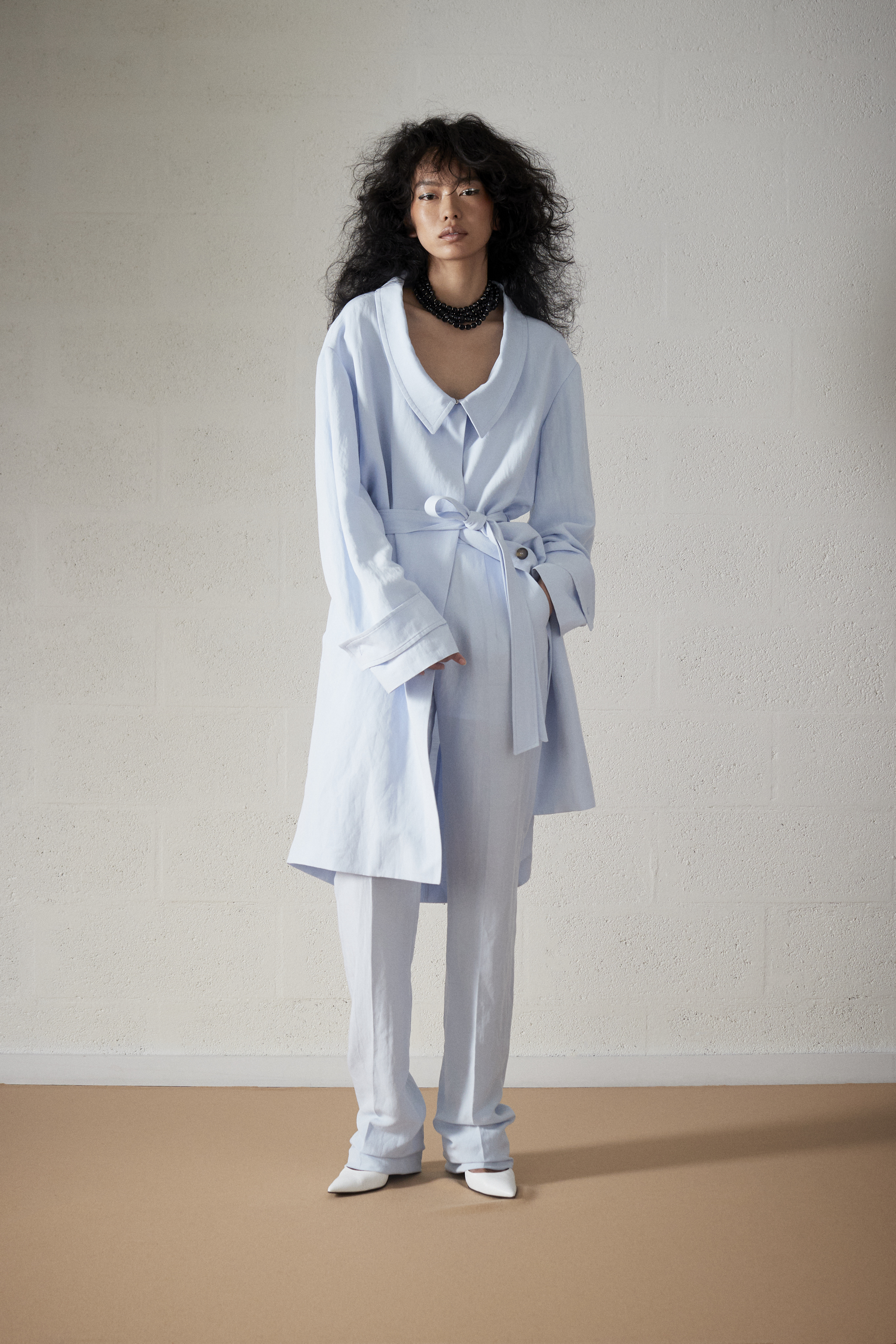 Fluid coats in linen or cotton are cut with a round, open neckline and worn with pearls or strands of crystals.