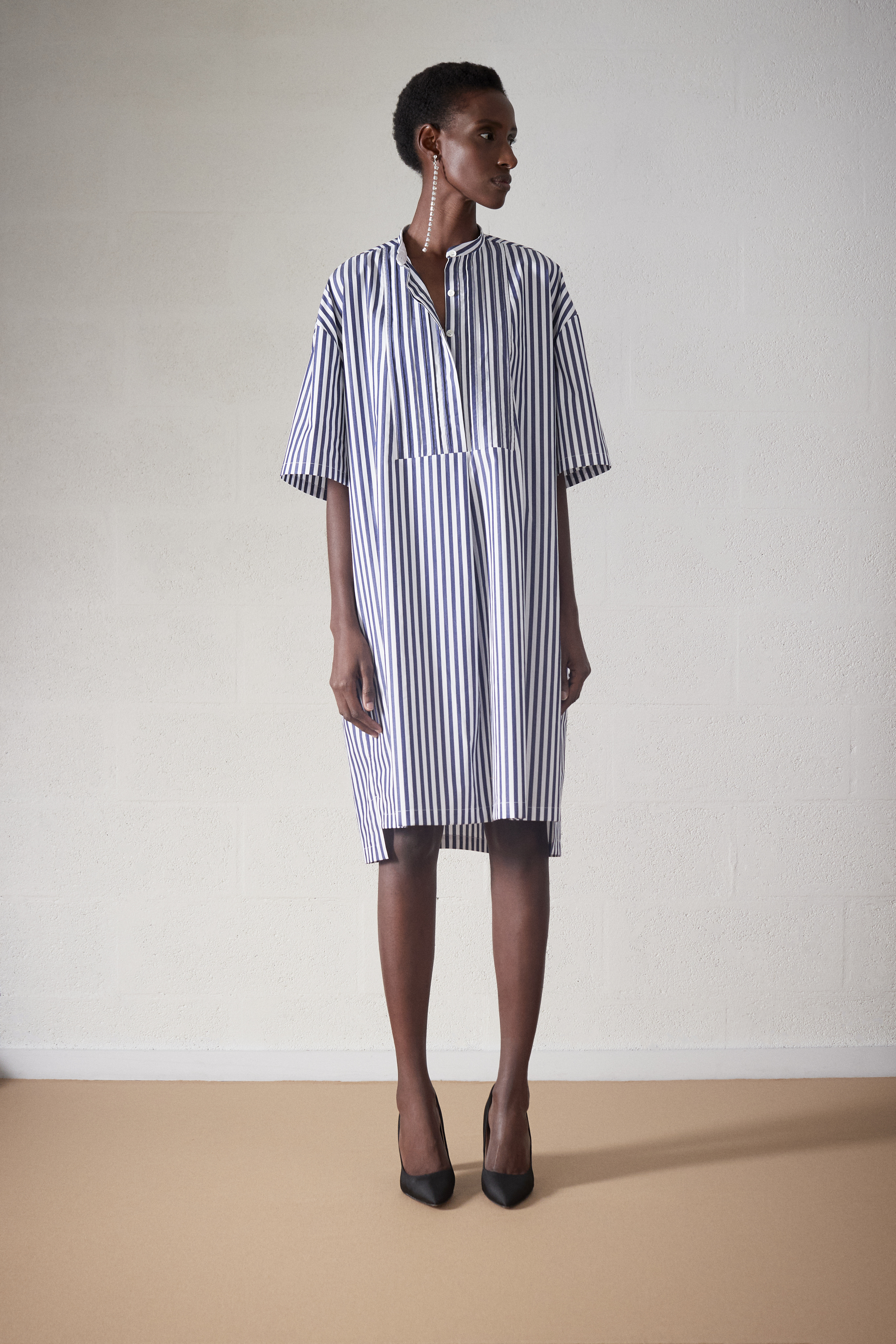 A classic shirt shape is cut in rainproof nylon for use as a raincoat, or in light cotton poplin to be worn as an airy summer dress.