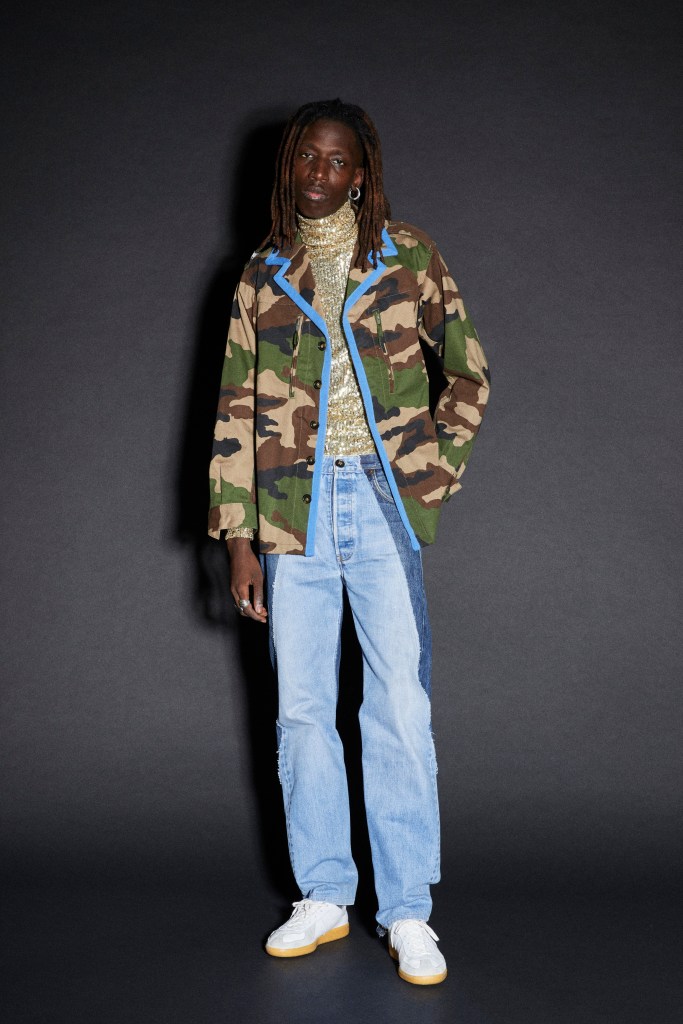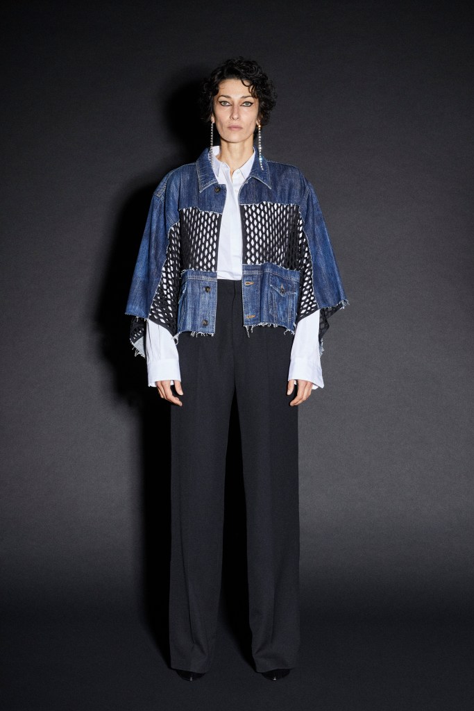 A jacket in denim has a sequinned band cut into the back, creating the silhouette of rounded back