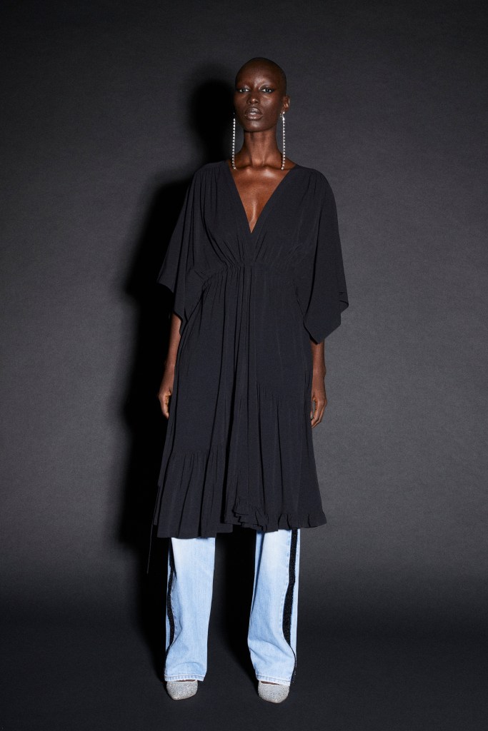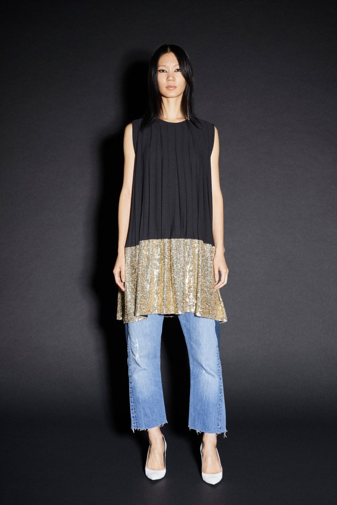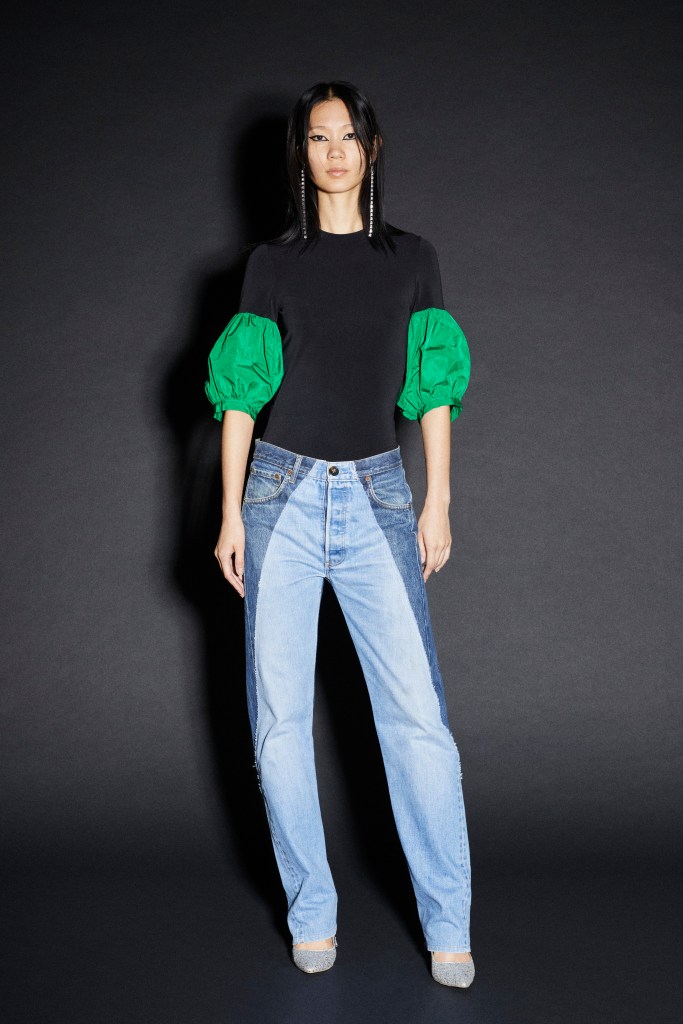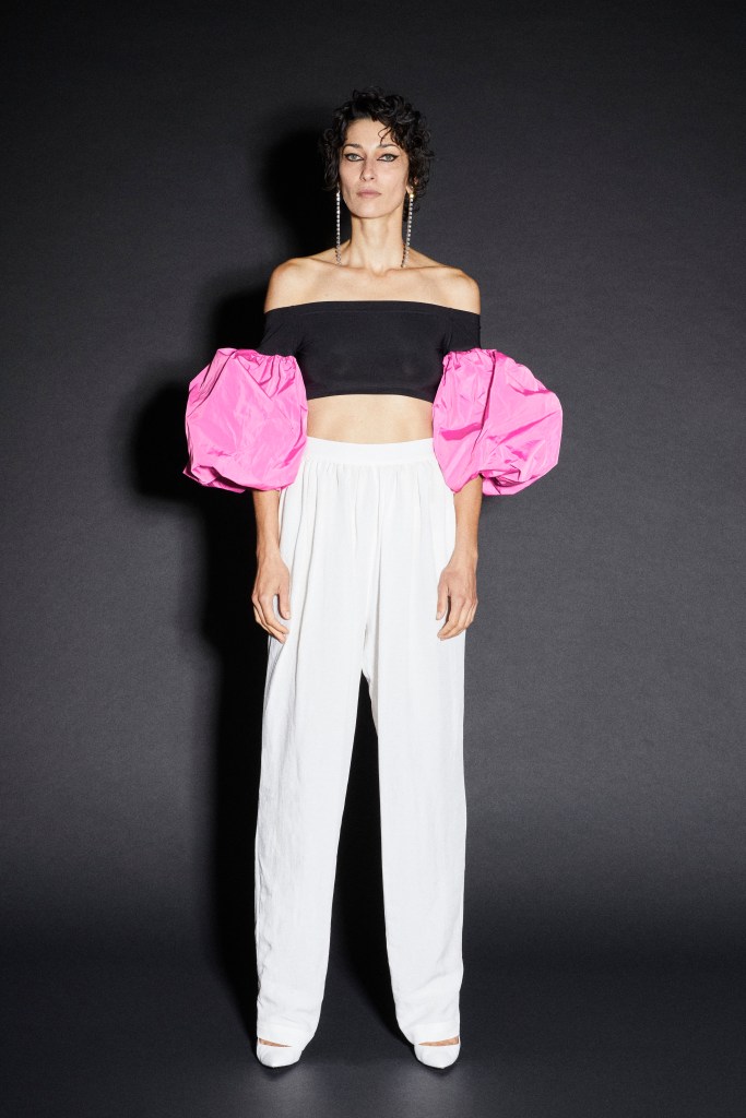 The same sleeves are mounted on a simple T-shirt or bandeau top and worn with pants or our two-tone bias jeans.
