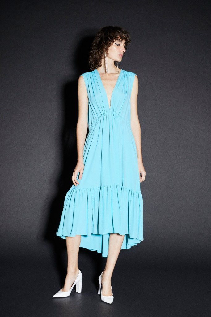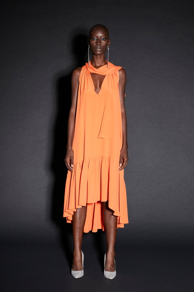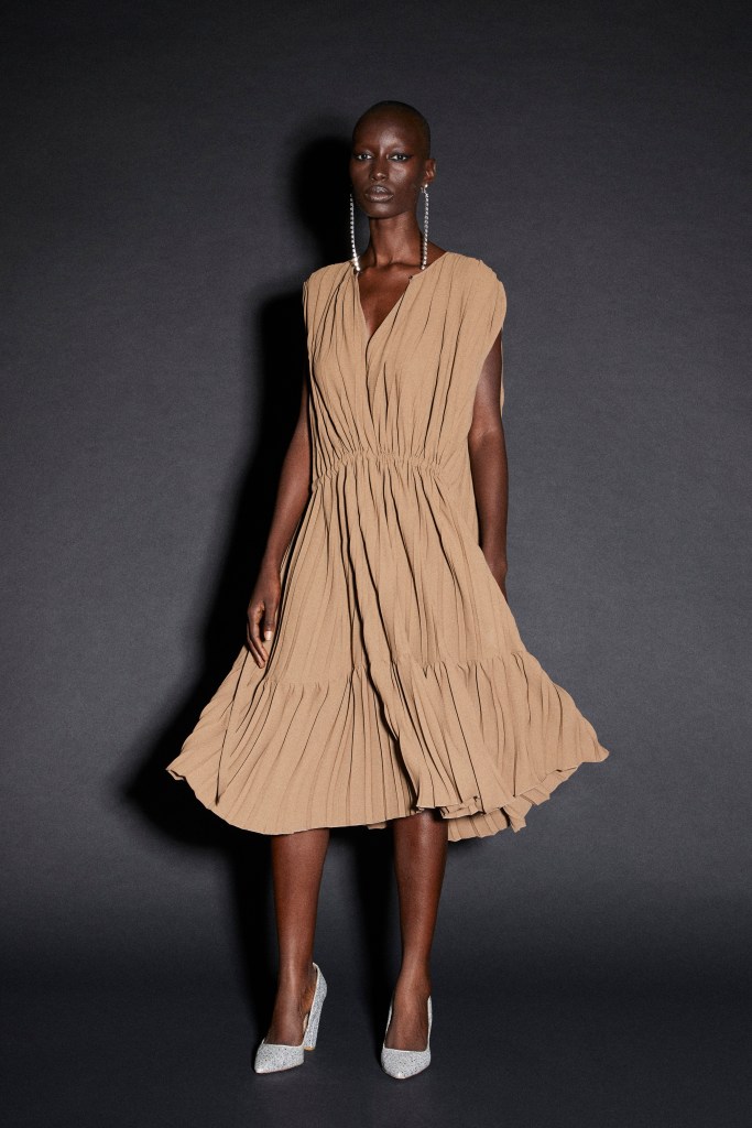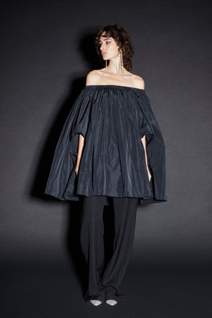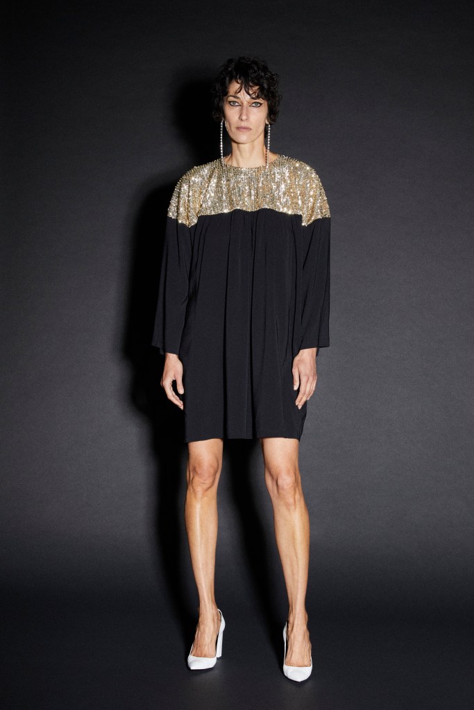 A cape-like shoulder -less dress is paired with a pair of biker shorts in gold sequins.