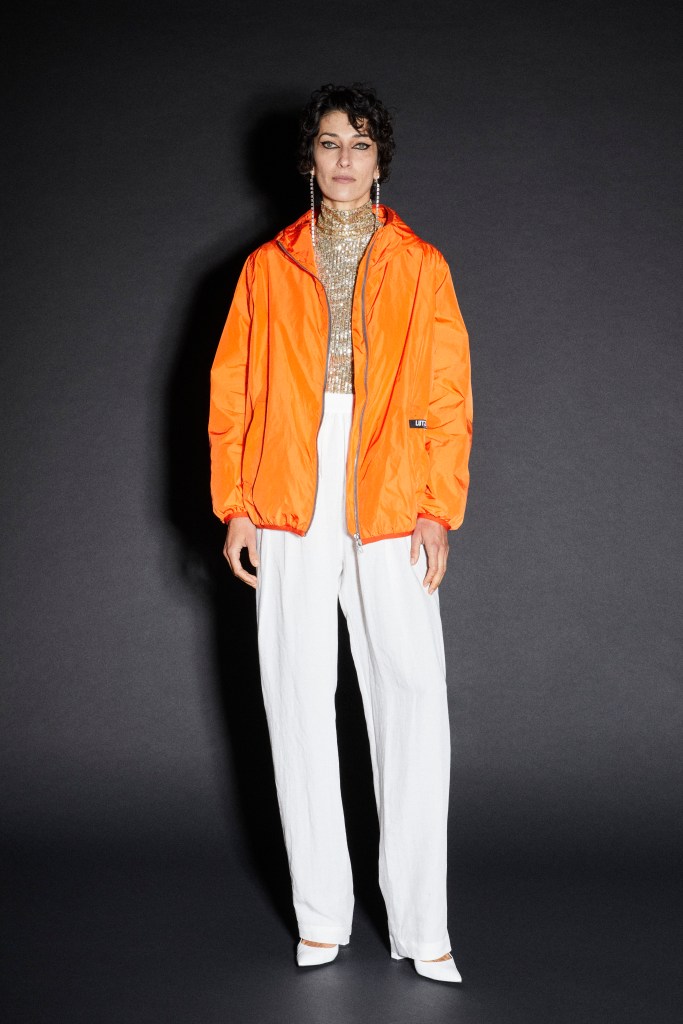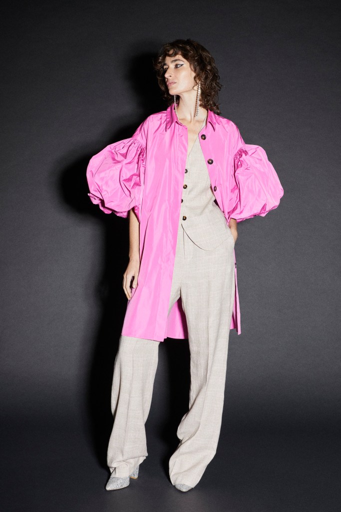 A pink top in taffetas is worn over a striped shirt and tailored pants.