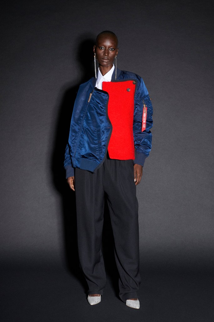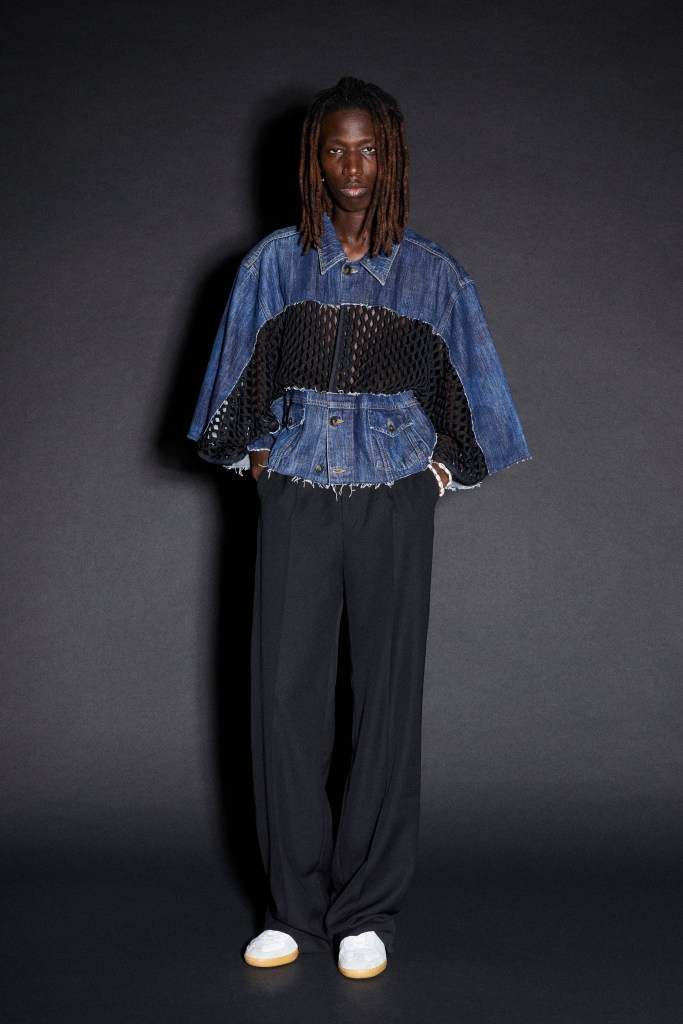 An elongated waistcoat with its lower part replaced by a vintage denim jacket is worn with a short sleeveless blazer over pants or a skirt.