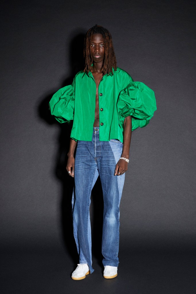 A shirt-coat with pouf sleeves is worn over a tailored waistcoat and pants in a cotton linen mix.
