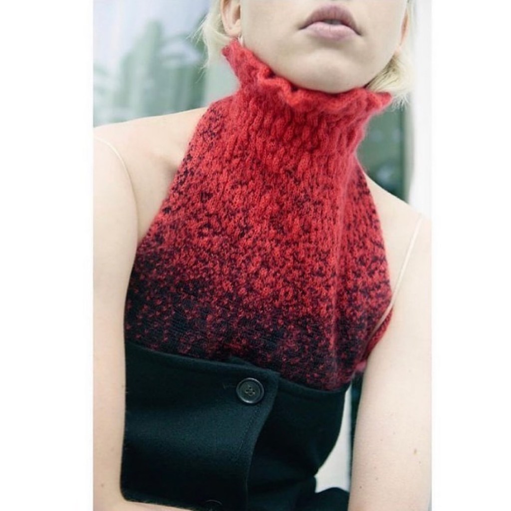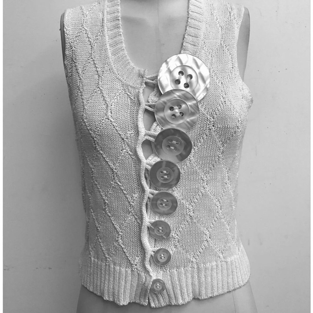 1. Graded Buttons on a sleeveless cardigan2. Giant Cable Sweater from my very first Collection, Fall/ Winter 2000, in turn inspired by my Central Saint Martin’s Degree Collection3. White Sweater in Cotton overprinted with black and closed in back4. Twisted Front opening sweaterOversized scarf evening dress in gold lurex6. Long Cardigan with glove-shaped pockets7. Shoulder Top with fringed sleeves8. 4 patterns 4 colours knitted dress9. Backless Haltertop in Mohair Jacquard10. Norwegian Pattern Cardigan with insert in wadded nylon