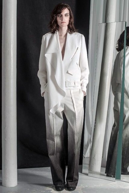 ..the thing with inspiration is that it’s never foreseeable nor can it be planned. I’ve spent hours staring at a white page waiting in vain for the sparks to fly, only to be waking up at three in the morning with my brain on fire 😝This collection, Spring/ Summer 2014, happened while sitting in a cab going to work in Italy. I had arrived in the morning and stepped out of the plane into gorgeous sunshine, and for a second I had an incredible urge to tell the driver to go past the factory and straight to the next beach… so this collection became about spending the day at the beach still dressed for work- a collection in black bleached out by the sun. Tie-dye, fading prints, stripes, bleached knits and wet- look wool and denim, as if having rushed into the sea with your suit still on. Dresses and tops were draped like towels slung over the shoulders or tied around the waist. My favourite look was a bleached biker jacket, partly draped, worn over a pair of oversized denim pants bleached out towards the upper part.