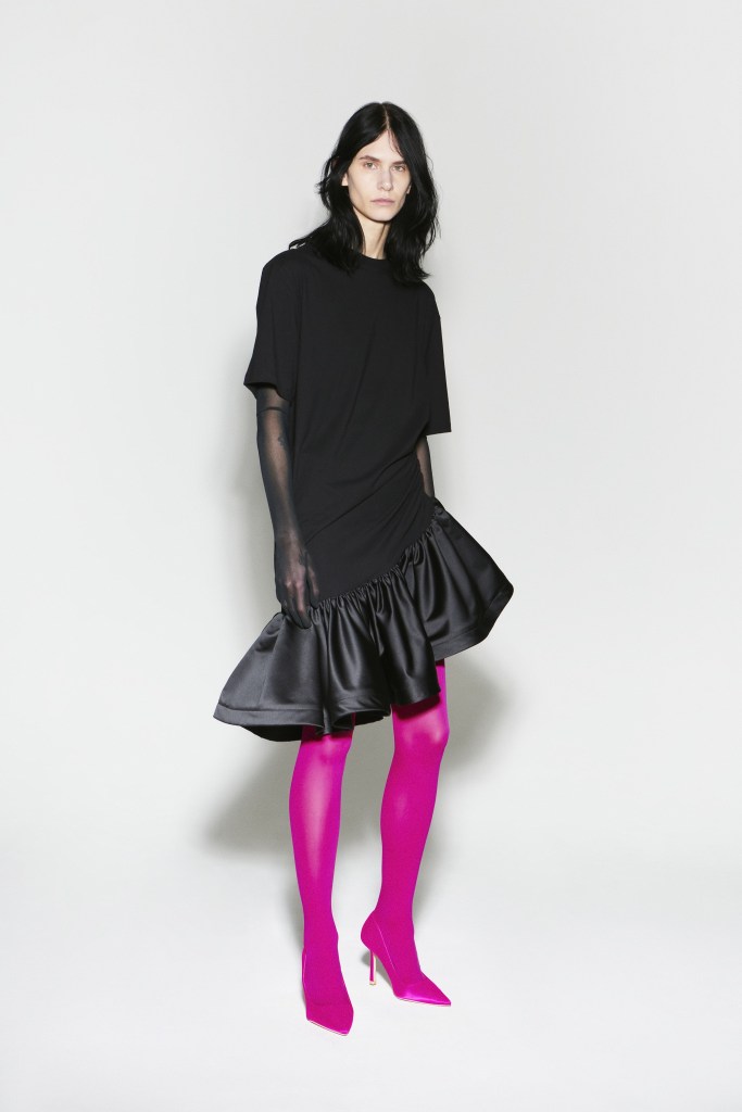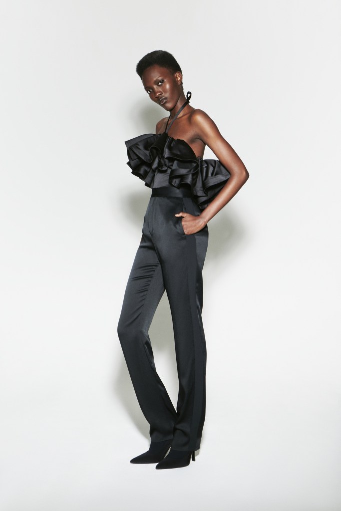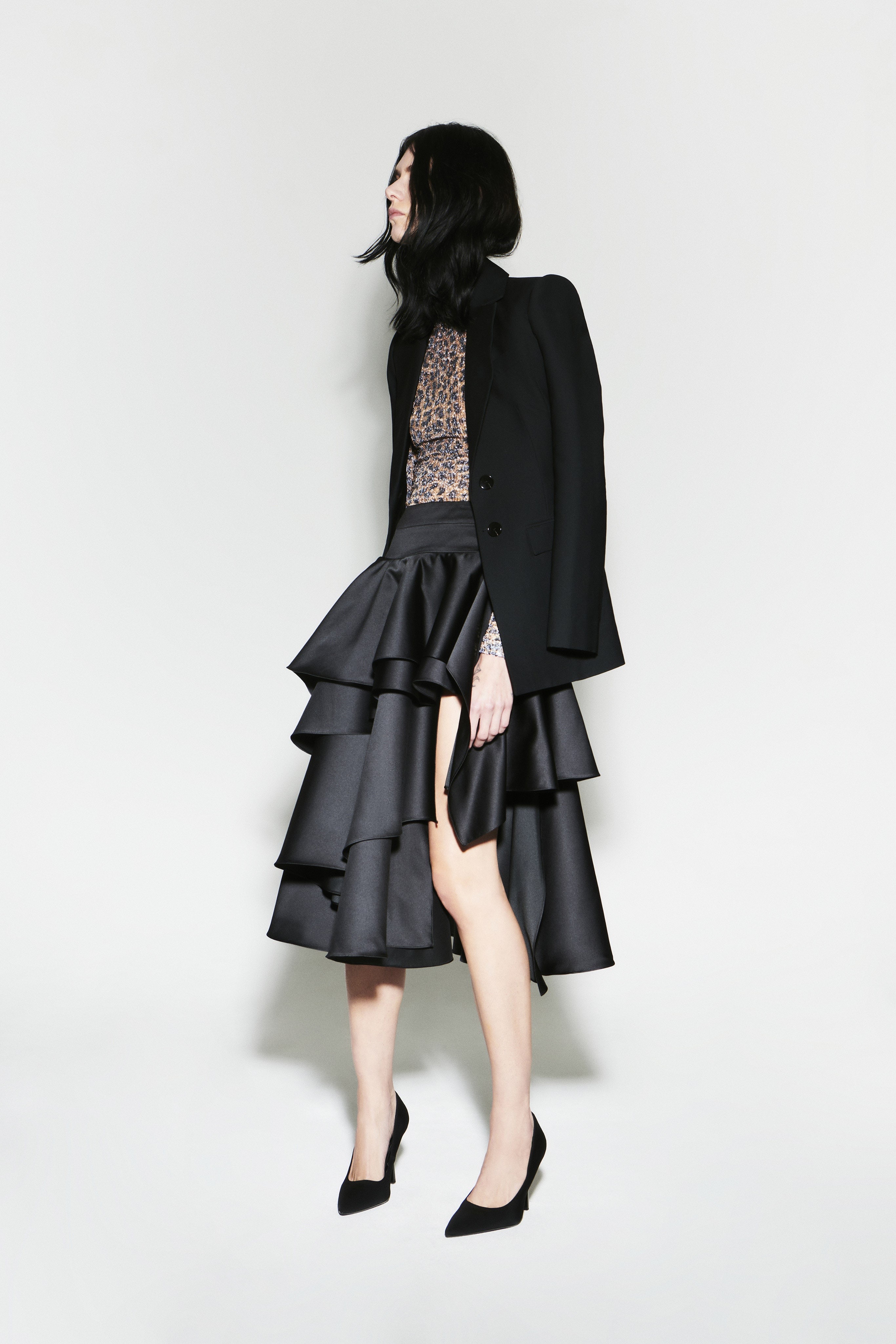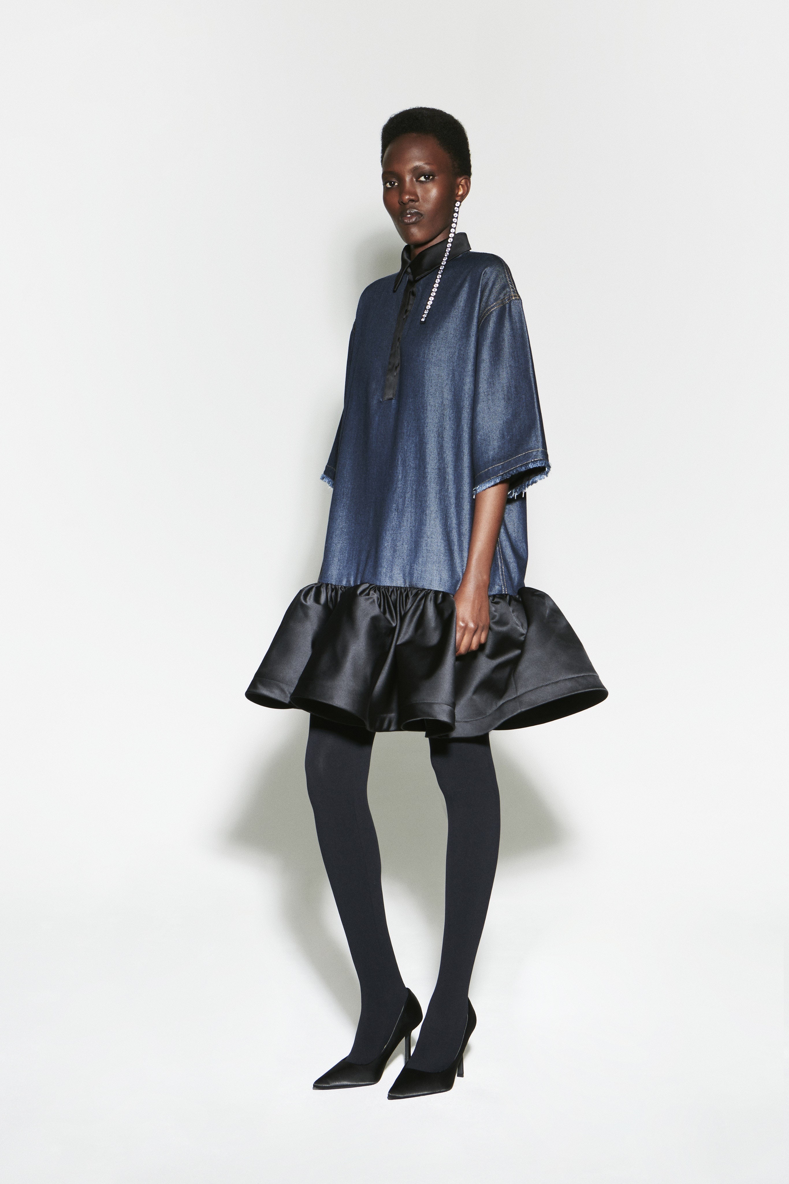 asymmetric dress ridged with ruffles that dance around the body, or a denim suit in a