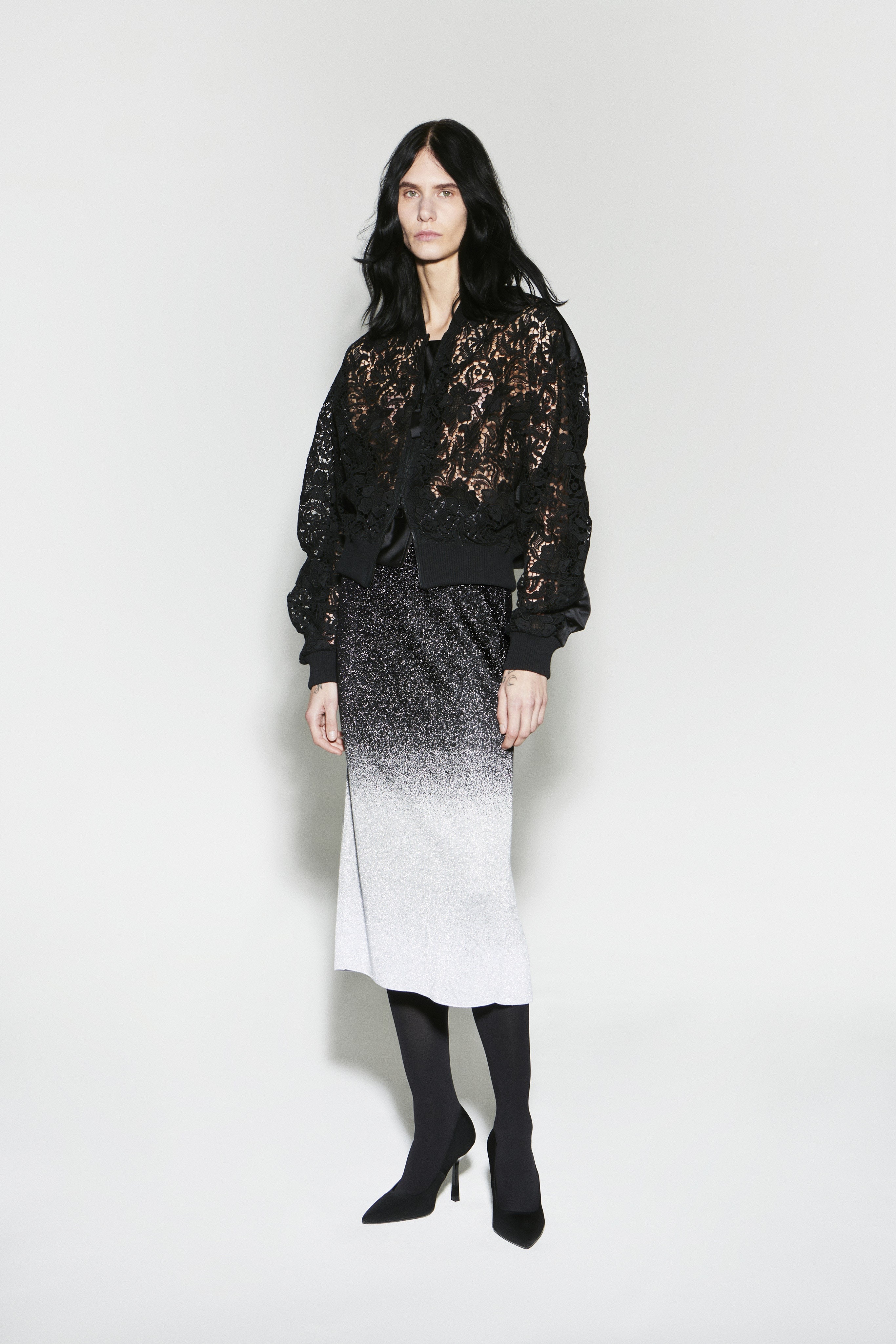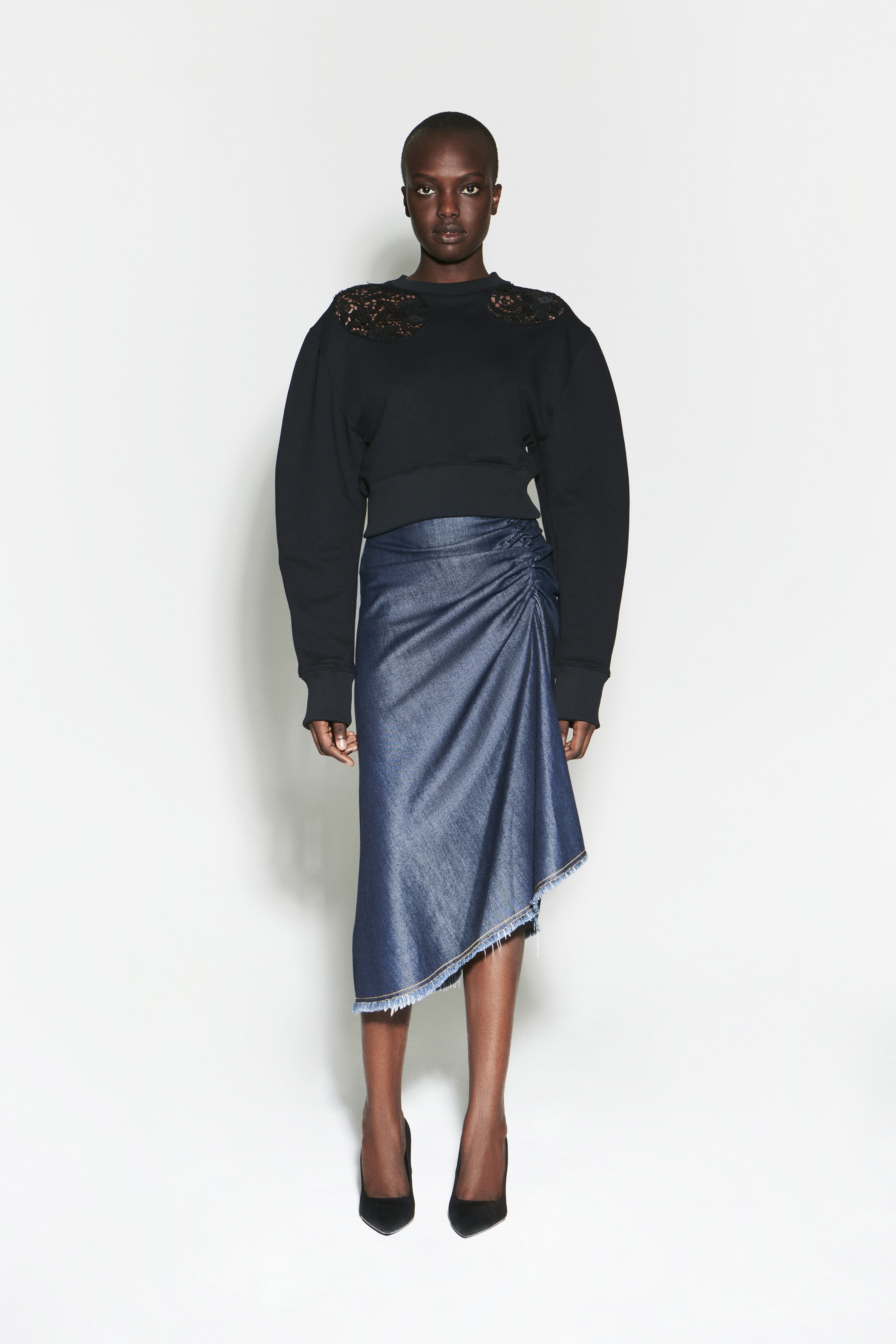reveals the leg; trousers spliced with a fine lace tuxedo trim; a cropped sweatshirt laser-printed