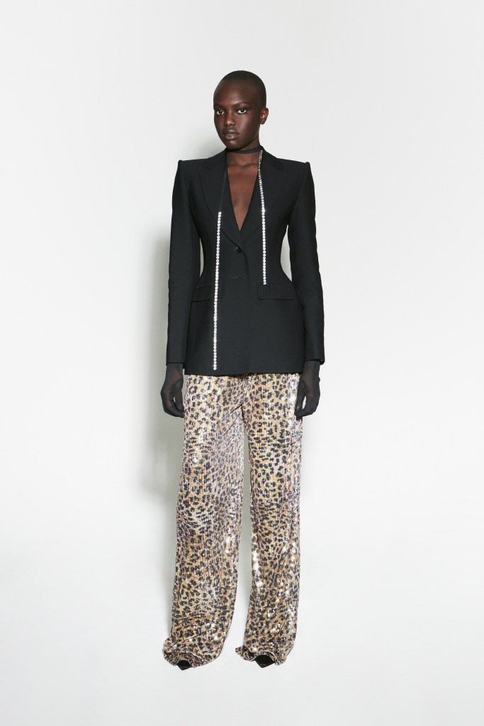 trousers and tops that mix with tailoring or sporty bomber jackets. Other surfaces glisten