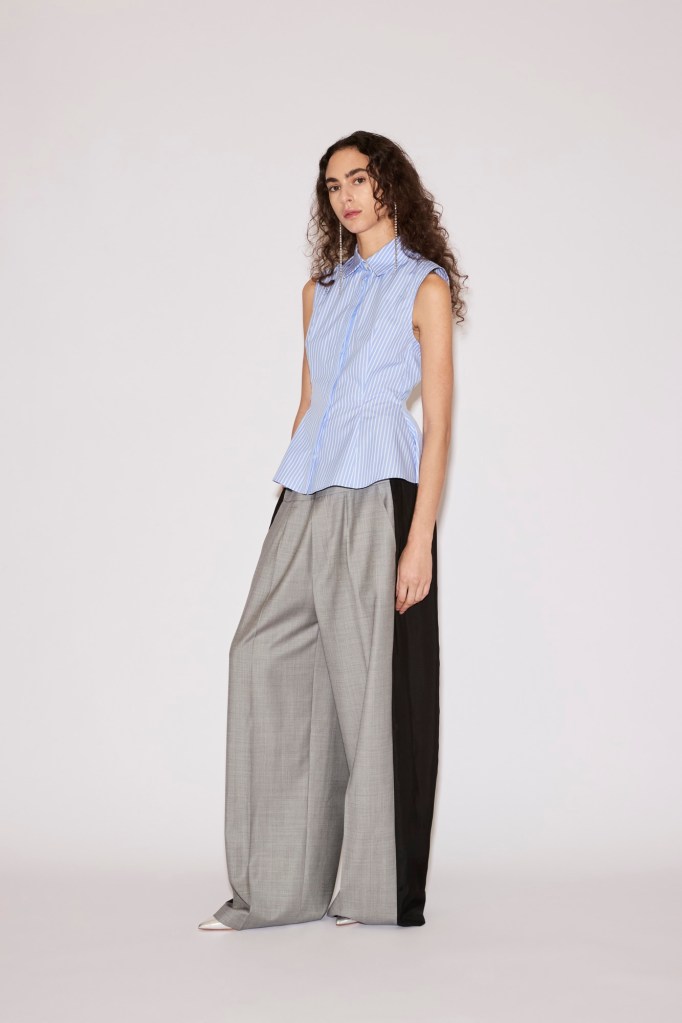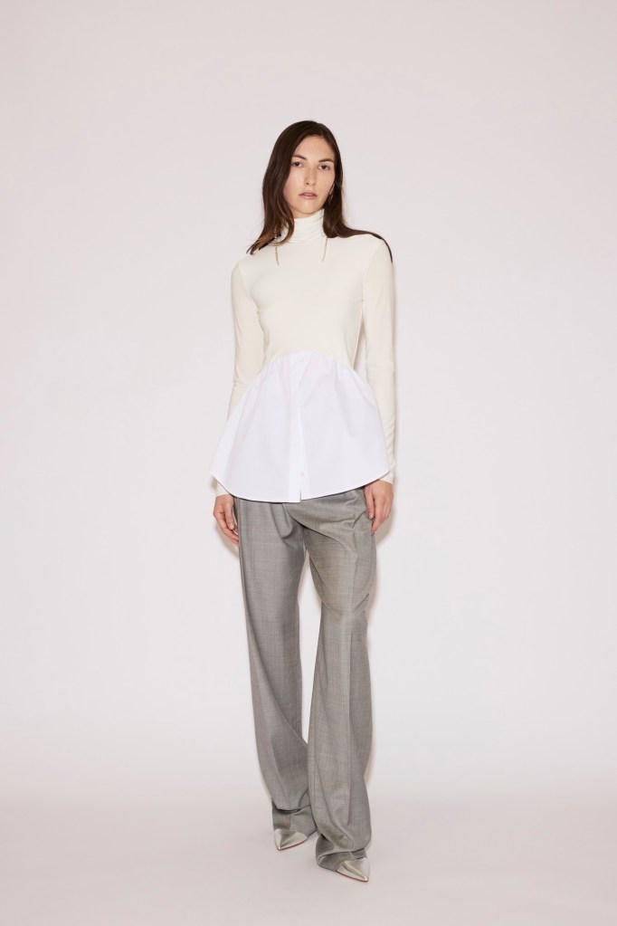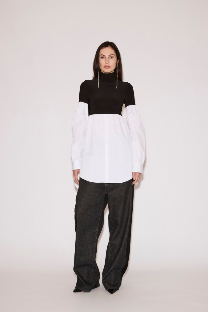 An oversized cotton shirt is spliced with a jersey bodice that clings to the frame, simultaneously tracing the body’s outline and letting fabric drift freely around it. A top and dress echo the fluidity of a scarf at the neck, cascading softly across the figure.