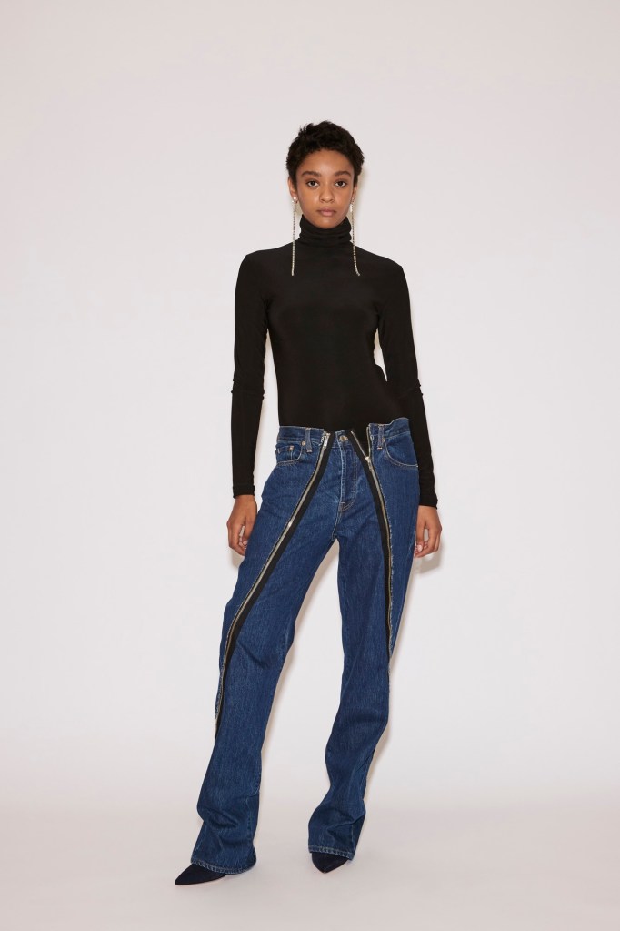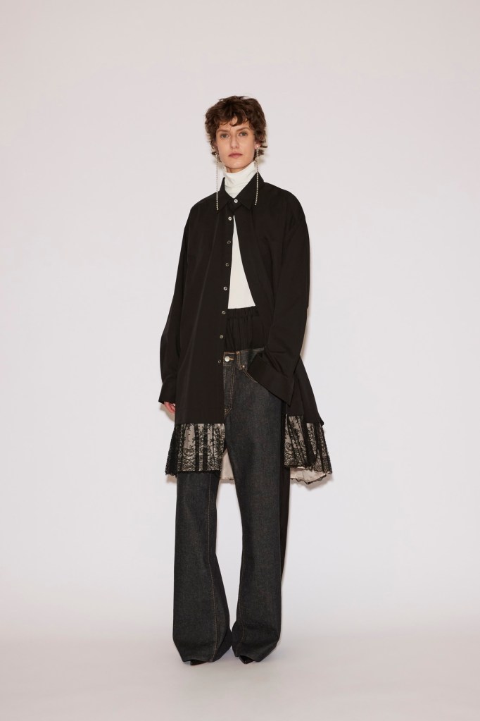 Bands of traditional French lace edge the hem of a voluminous shirt or a sleek fitted top, worn with wide tailored trousers for contrast. Gold zippers slash diagonally across the neckline of a denim jacket and down the legs of jeans, serving as both closure and ornament.