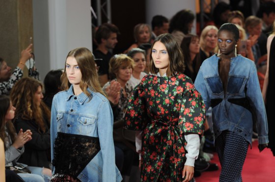 “…this whole notion of old and new is completely gone, in a way, because a beautiful garment is a beautiful garment…there’s no rule about how people dress these days,” the designer observed backstage before the show. Taking full advantage of this welcome state of affairs, he offered a lineup of deconstructed jean jackets, bombers with ruffles or drawn tight to the waist with a Fifties New Look flair, and, what he claimed to be his first jacquard cocktail dress. This, he tucked under a trenchcoat and, in a pin-striped version, layered on top of matching trousers. (..) The alligator print was very chic. So were the polka dots (..) applied to a dress paired with matching boots. The added measure of elegance overall contributed to the strength of this forward-looking collection.” Mimosa Spencer on LUTZ HUELLE SS19 on WWD
