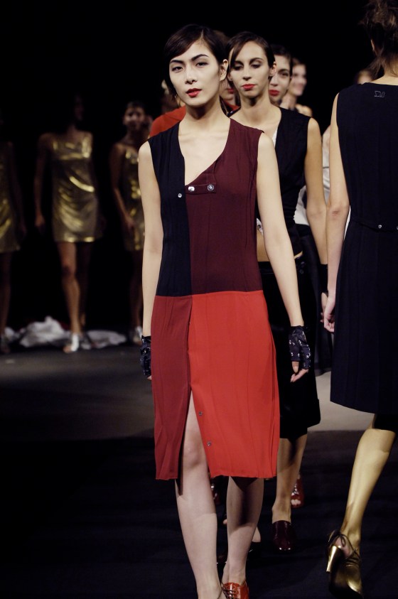 LUTZ HUELLE No.12 S/S 2006 ‘THE PURPLE BASSEY KRAFTWERK SHOW’ This is the collection that should not have been- left for dead after a hostile takeover bid the company found itself without neither production facilities nor funds for the collection and should, by any means, have gone bankrupt there and then. At the eleventh hour (and against all odds), a collection was designed and prototypes were made at the last minute in our studio in Paris, on a shoestring budget and with the goodwill of everybody around us. Being in a state of utter panic, I did what I always do when things get rough: listen to Music. I divided the collection into three groups, based on songs by Deep Purple, Kraftwerk and Shirley Bassey. For the show, we asked friends to do routines to the three songs and change their outfits when the song changed. The lovely Lola (Laurent Mercier) came out at the end to mime to Shirley Bassey, which made me finish the season with a smile on my face, in spite of everything. Penny Martin from Showstudio called the collection ‘stylish in a quiet way’ and I will forever love her for it.